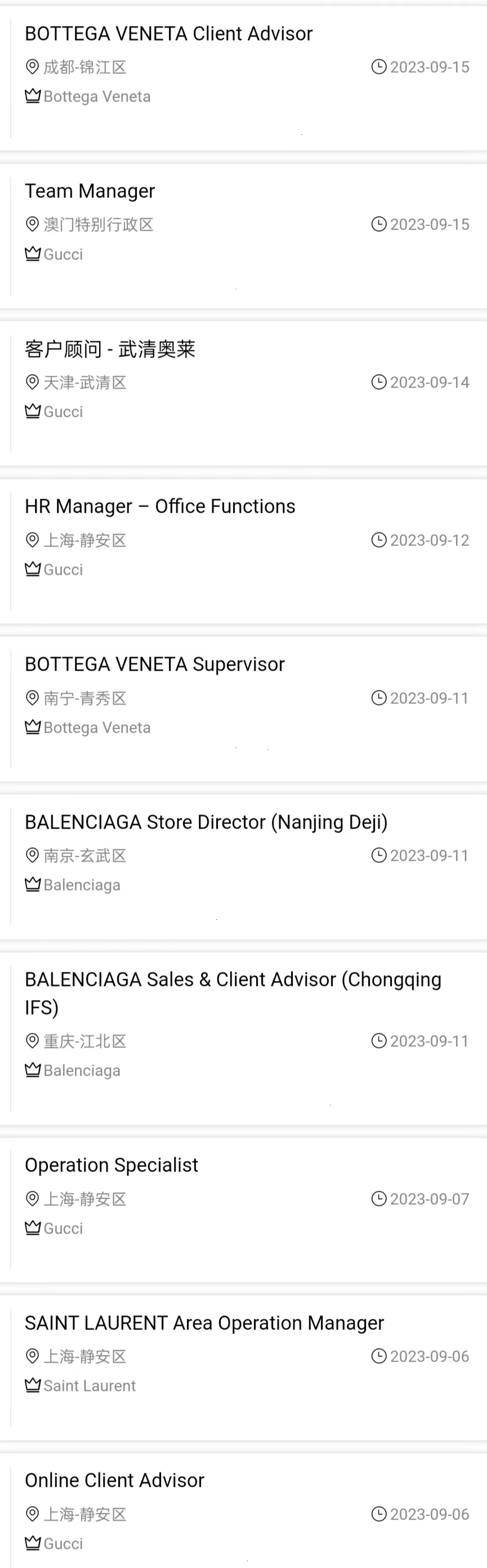 ![]() 文末获取投递方式&求职资料 公司简介 开云集团(Kering)成立于 1963 年,是全球时装及配饰行业的翘楚。开云集团的业务专注于奢侈品与生活时尚产品,旗下拥有20个国际品牌,囊括Gucci、Bottega Veneta等经典品牌,亦包含亚历山大·麦昆等前卫品牌。开云集团专注单一的业务,在快速增长的奢侈品市场内,设计、制造以及推销其产品。 01 福利待遇 ★13薪,五险一金,绩效奖金,年底双薪; ★开云为员工提供灵活的工作方式,让每位员工能平衡其生活与工作; ★为员工的专业能力提升,个人职业发展以及全球性的工作调动等提供奖励和机会,让员工能构筑自己多样化和灵活性的职业发展道路; ★为员工提供开放、多元和激励人心的工作环境,让员工勇于创新,敢于开拓,激发灵感、尽情绽放和持续成长; ★开云的育儿政策旨在确保员工在工作与生活之间取得更好的平衡,每位新晋父母,无论其个人或家庭情况如何,均享有14周带薪假期来照顾新生儿或新收养的孩子; ★带薪年假,通讯津贴,团队聚餐,子女福利; ★品牌内购价,定期体检,年度旅游,节日礼物等 02 招聘岗位