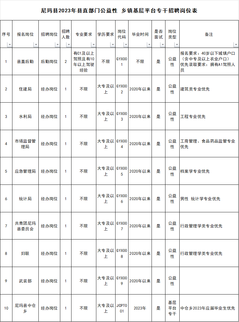 西藏自治区尼玛县2023年 县直部门公益性乡镇基层平台专干招聘公告为全面贯彻落实习近平新时代中国特色社会主义思想,拓宽我县就业渠道,促进我县高校就毕业生充分就业,根据《西藏自治区公益性岗位开发管理暂行办法》(藏政发〔2014〕87号)、《那曲市基层劳动就业社会保障公共服务平台管理暂行办法(试行)》(那人社发〔2018〕60号)文件精神,结合尼玛县工作实际需要,拟面向社会公开招聘公益性10名、乡镇基层专干1名,招聘公告如下。 一、招聘对象 主要面向2020年-2023年全日制尼玛籍高校毕业生招聘,部分岗位面向2023年全日制应届尼玛籍高校毕业生及40岁以下城镇户口(含中专及以上农业户口)。 二、招聘岗位类别及名额 此次计划招聘11人(县直部门公益性10名、中仓乡基层平台专干1名)。试用期1个月,属于政府购买岗位外聘人员,不属于机关事业单位在编人员。 三、报考条件 (一)招聘对象应当具备以下资格条件 1.拥护中国共产党领导,遵守中华人民共和国宪法和法律,政治素质高,思想品德好,身体健康,热爱报考岗位工作,具有正常履行职责的身体条件和心理素质。 2.具有符合招聘岗位要求的工作能力和其他资格条件,具有较高的专业知识水平和业务技能,服从招聘单位管理及工作安排。 3.各招聘岗位具体报考要求和专业限制详见附件。 4.具有招聘职位和法律法规规定的其他条件。 (二)招聘对象有下列情形之一的不得报考 1.政治立场动摇、理想信念缺失的。 2.在反对分裂、揭批十四世达赖、维护祖国统一和民族团结等重大政治原则问题上态度暧昧、与党和人民离心离德、同情支持达赖集团、参与分裂破坏活动的。 3.因犯罪受到刑事处罚的。 4.应届毕业生截至目前未取得毕业证的。 5.在职乡村振兴专干、村(居)科技专干、 村(居)医务人员、农业农村工作专员和乡村幼教人员及单方面解除合同或因个人原因被解除合同的“五类人员”、已报名2023年尼玛县卫健委面向社会公开招聘基本公卫专干人员。 6.其他不适合岗位要求情形的。 (三)招聘注意事项 1.本次报考采取线下报名,实行诚信报考,招聘全流程如发现虚假信息报考或不符合报考条件的将取消报考及聘用资格,并视情况进行相应处理。 2.报考人员需按照各类岗位要求的毕业时间、学历、专业等限制条件进行报考。 3.每名考生只能报考1个招聘岗位,同时可选择是否服从本行业类型岗位调剂。 4.招聘岗位等具体要求详见附件。 四、招聘程序 (一)报名与资格审核、考察 1.报名时间:2023年9月20日--9月23日(9:30-12:30;15:30-18:30)。 2.报名地点:尼玛县人力资源和社会保障局 二楼就业办公室 3.报名方式:本次报名采取现场报名的方式进行。 4.报名所需材料:报考人员须提供尼玛县2023年县直部门公益性 乡镇基层平台专干招聘报名登记表、学信网上打印的教育部学历证书电子注册备案表;身份证、学历证书原件及复印件;本人近期免冠正面蓝底1寸照片(含电子版)。报考人员需如实填写《报名登记表》相关信息,诚信报考。凡弄虚作假一经核实,取消录用资格。报名一律使用有效期内的第二代居民身份证,如有遗失请在辖区派出所开具证明。 5.报名资格审查:2023年9月24日,公开招录领导小组办公室对报名人员进行资格审查,对未通过资格审查的,将有关情况反馈报考人员。 6.领取准考证:考生准考证由尼玛县人社局统一制发,并通知领取。 (二)报名须知 1.考生在报名时须诚信报考,如实填报有关个人信息,凡弄虚作假,不诚信报考的考生,一经查实,取消聘用资格。 2.考生须根据自身情况认真严肃选择报考岗位,一经上报不得更改。 3.考生须在规定时间内报名,因考生个人原因出现的报名问题,后果自负。 (三)笔试(占60%) 通过报名资格初审的人员参加笔试,笔试工作由尼玛县人社局负责组织实施。 1.笔试内容:公共基础知识(经办岗位),驾驶理论知识(后勤岗位),满分100分。 2.笔试时间:9月26日上午9:30-11:30 3.笔试地点:准考证标注的地点为准。 4.划定合格分数线:由招考领导小组根据考生笔试成绩统一划定最低合格控制分数线。原则上按职位计划录用人数1:2比例,从高分到低分的顺序,分别划定合格分数线,并确定参加面试人员。 5.笔试成绩:拟面向社会公布笔试成绩。 (四)面试(占40%) 1.笔试合格人员参加面试。面试工作由招录工作领导小组办公室具体负责,面试考官一般为3-5人。具体人员由县人社局组织安排。 2.面试以结构化为主。主要测试综合素质、语言表达能力、组织协调能力,职业技能,满分100分。 3.面试时间和地点根据情况由招录工作领导小组办公室统一安排,另行通知。 (五)录用 被录用人员试用期为一个月。试用通过后,办理正式聘用手续,并签订聘用劳动合同,劳动合同一年一签。 五、聘用待遇 公益性: (一)试用期待遇:试用期一个月,标准为每人每月2730元。 (二)正式聘用后待遇=基本工资+绩效+生活补助+学历补贴组成。工资4130元/月(含“三险”(养老、失业、工伤)),学历补贴600元/月,仅享受5年。 (三)依法享有产假、带薪休假等权利,并执行国家法定节假日及双休规定。具体以《西藏自治区公益性岗位开发管理暂行办法》为准。 基层平台专干: (一)试用期待遇:试用期一个月,标准为每人每月3600元。 (二)工资5940元/月(含“三险”(养老、失业、工伤))。 (三)依法享有产假、带薪休假等权利,并执行国家法定