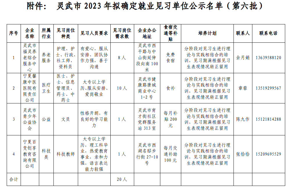 灵武市2023年拟确定青年就业见习单位公示(第六批)