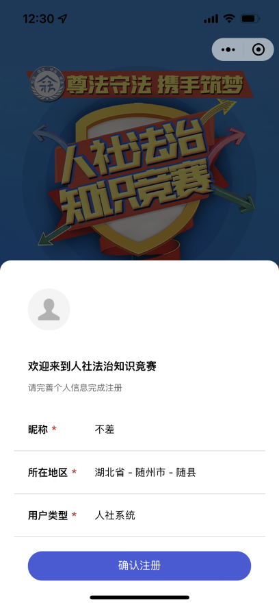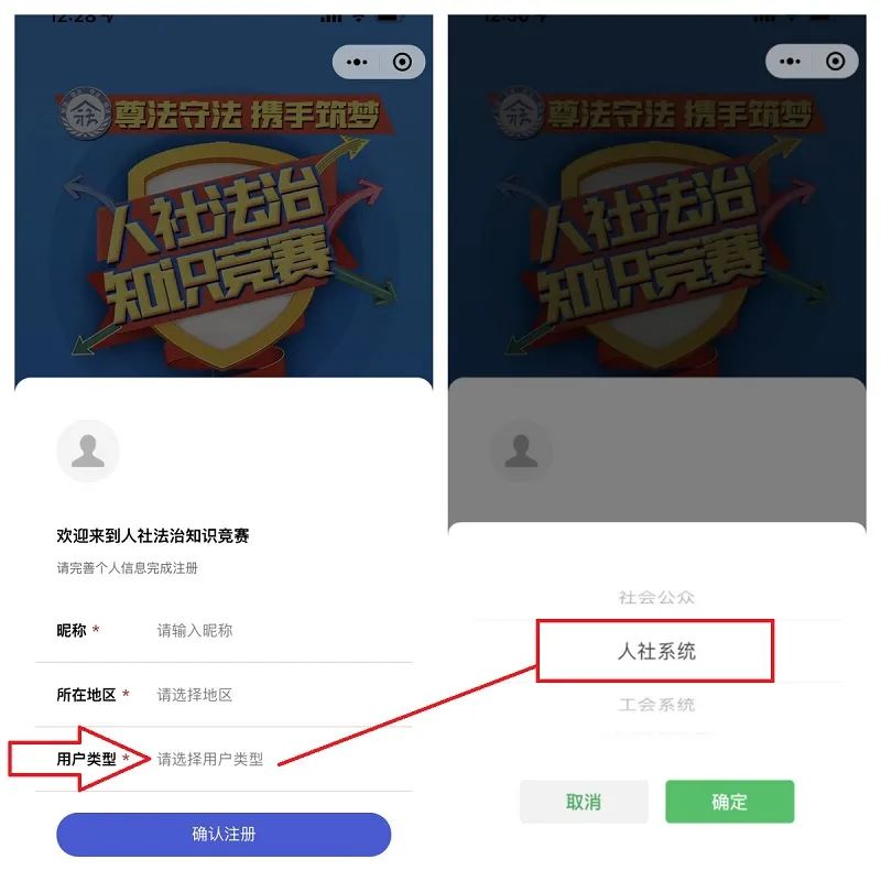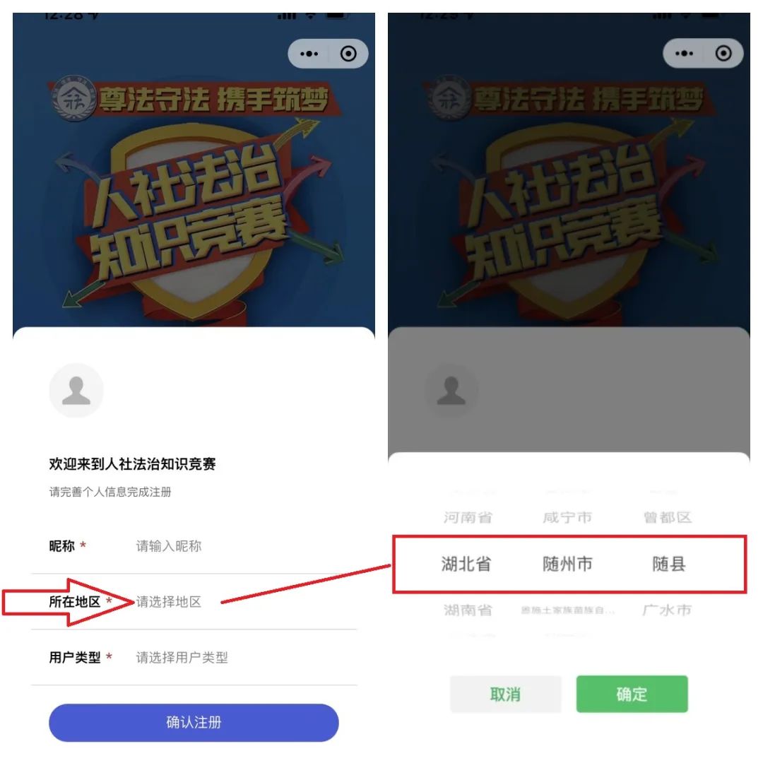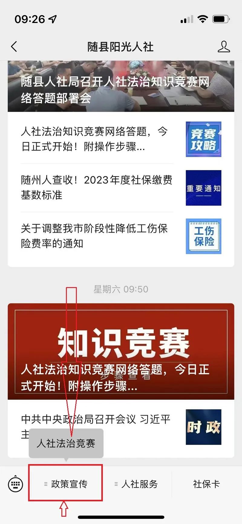 ![]() 一、活动时间 2023年9月1日至9月30日 ![]() 二、题目内容 深入宣传学习习近平法治思想、宪法、民法典、劳动法、就业促进法、劳动合同法、劳动争议调解仲裁法、社会保险法、安全生产法、职业病防治法、工会法、保障农民工工资支付条例、女职工劳动保护特别规定等法律法规以及近期开展的失业保险基金管理问题专项整治、职业技能培训和评价专项整治等涉及的政策法规。 ![]() 三、 参加人员 全省人社系统(含乡镇(街道)、村(社 区)基层服务平台)干部职工;广泛发动机关、企事业单位及社会公众参与。 ![]() 四、参与方式 1、扫描小程序进入答题 ![]() 2、通过“随县阳光人社”微信公众号进入答题 (1)搜索“随县阳光人社”微信公众号 (2)公众号左下角菜单栏点击“政策宣传”中的“人社法治竞赛” ![]() (3)进入答题小程序页面(点击右下角“个人中心”完善信息) ![]() 具体操作步骤详见如下...... ![]() 微信注册参与人社法治知识竞赛步骤共5步,请按找要求注册,参与答题。 步骤一 扫码进入主页面 打开微信程序扫描以下二维码进入人社法治知识竞赛主页面 (任选其一码扫一扫) ![]() ![]() 步骤二 点击个人中心完善个人资料 进入主界面后,点击右下角“个人中心”完善资料! ![]() 步骤三 完善个人资料并注册 1 在昵称栏目输入自己名字 ![]() 2 点击所在地区栏目选择湖北省--随州市--随县后点击确定 ![]() 3 点击用户类型栏目选择相应身份类型后点击确定后点击确定 ![]() 4 点击确认注册完成注册返回人社法治知识竞赛主页面 ![]() 步骤四 进行人社法治知识学习:点击知识文库选择相应内容点击学习 ![]() 步骤五 点击“在线竞答“,选择答题方式进行答题并获得积分(如何获取积分可点击活动规则查看) ![]() 总策划:杨金群 苏喜武