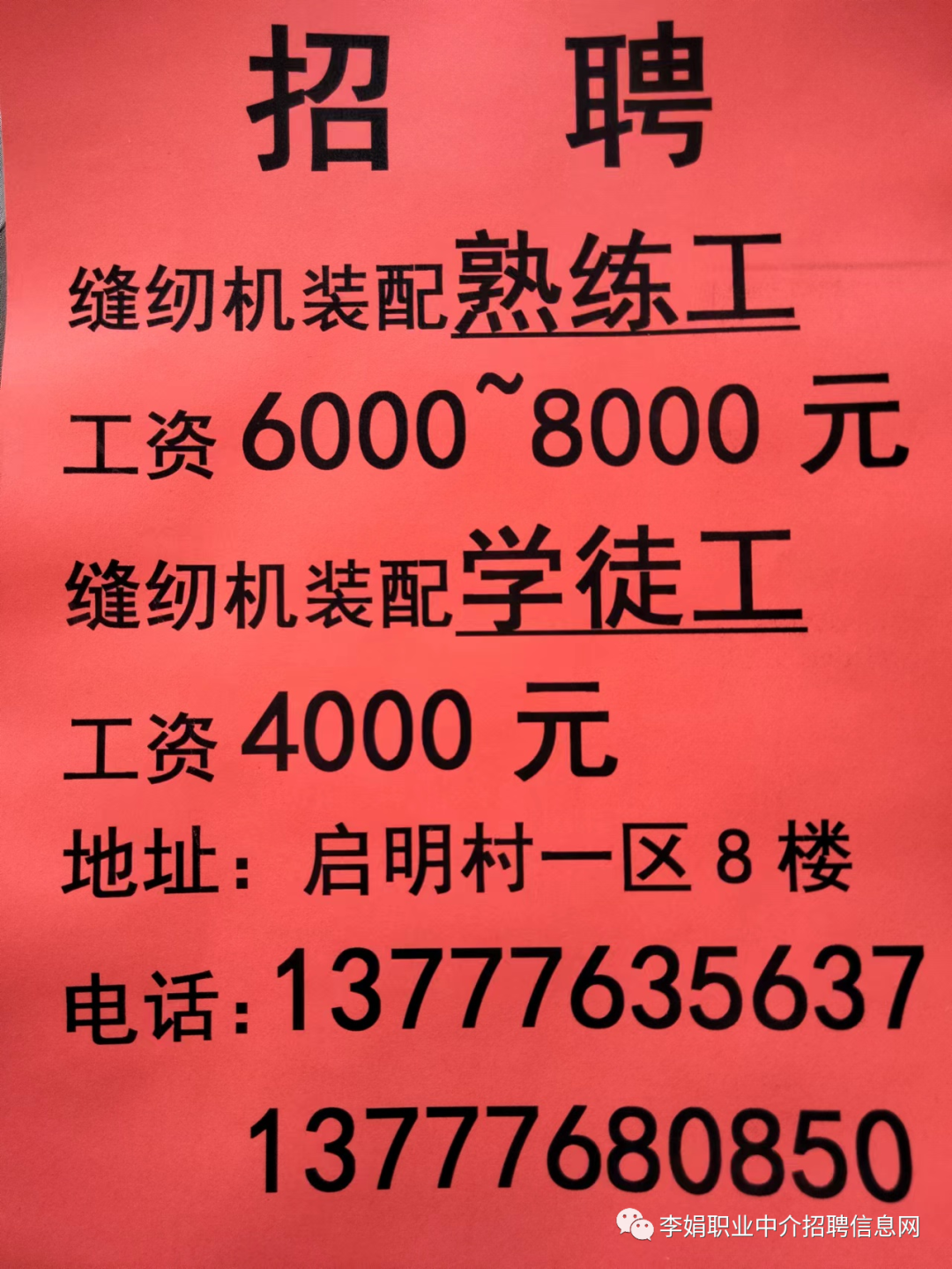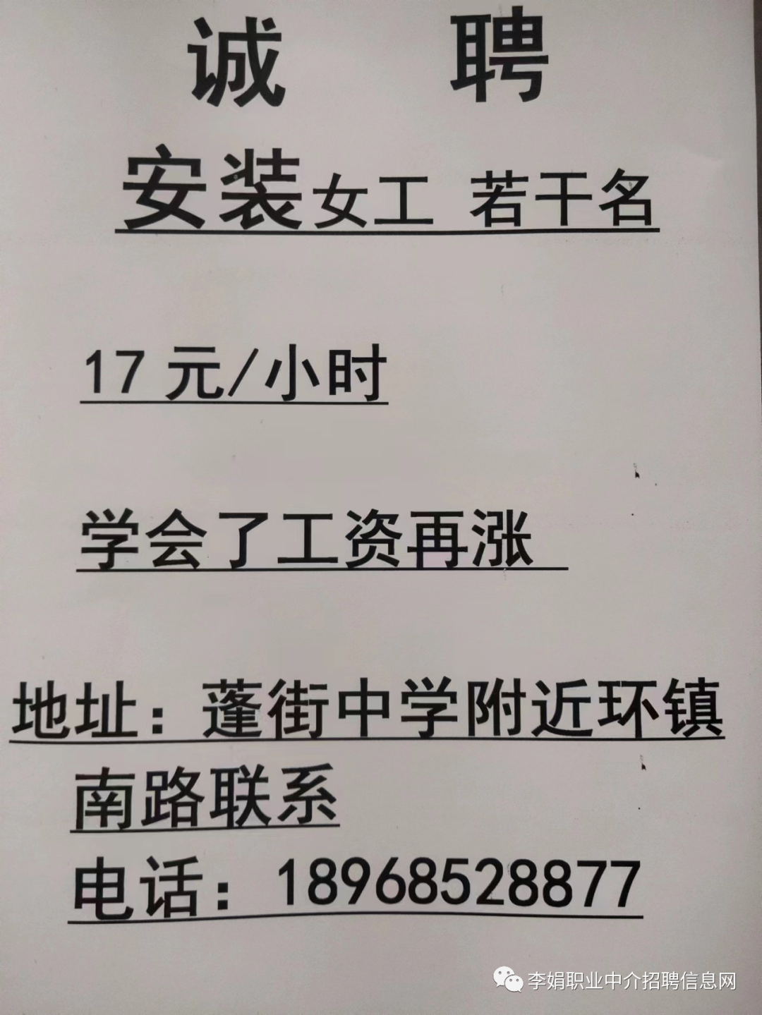 招聘:临时工 女工1名 安装女工5名 地址 :光明村 电话:13034296118