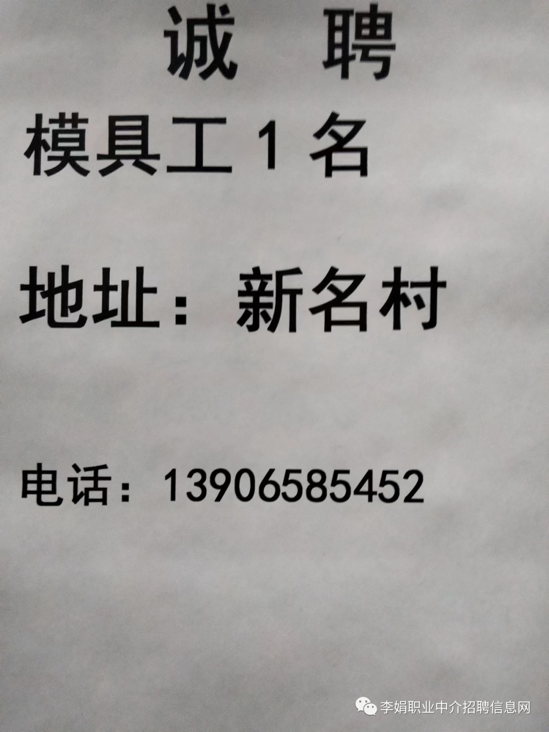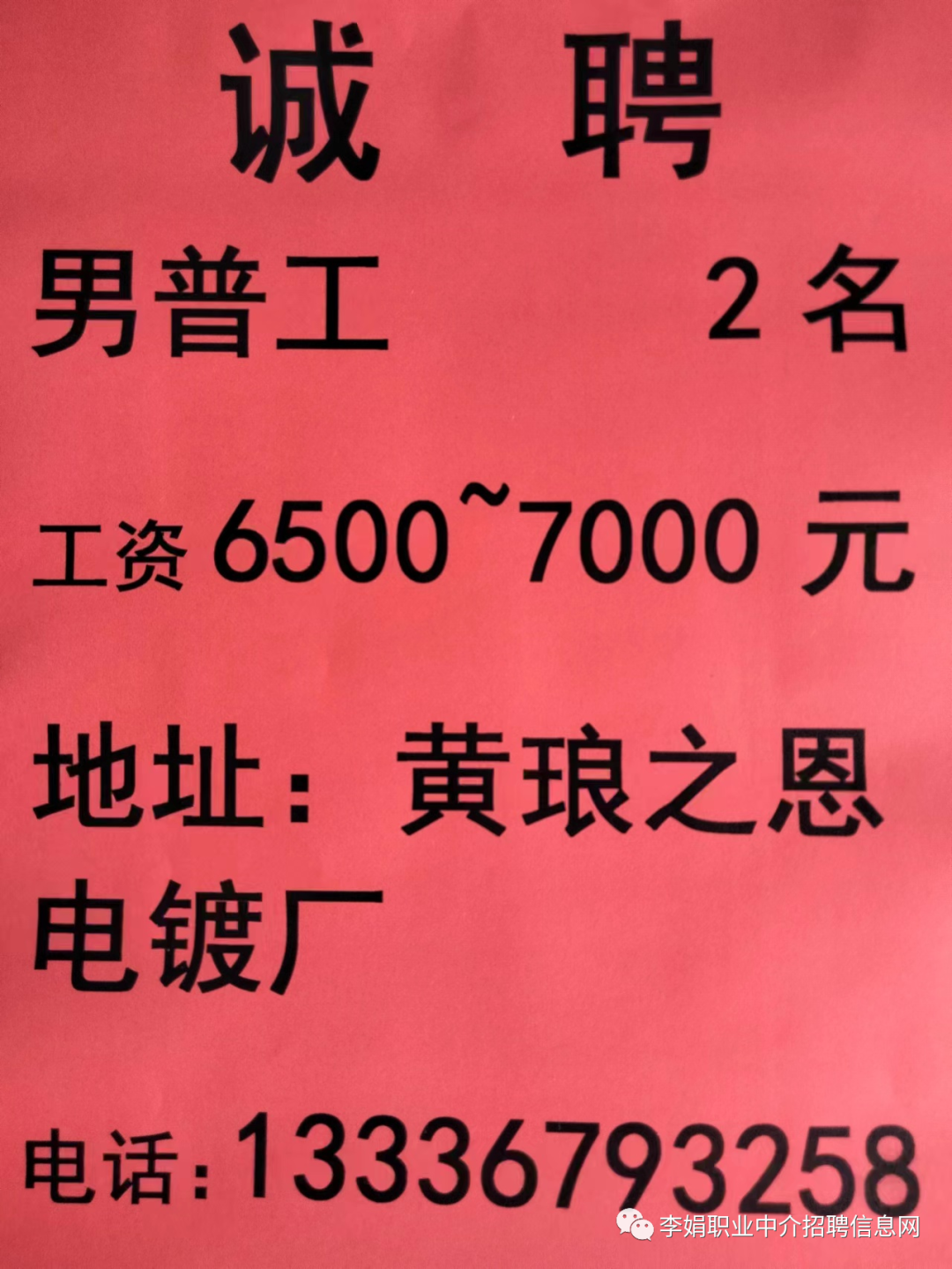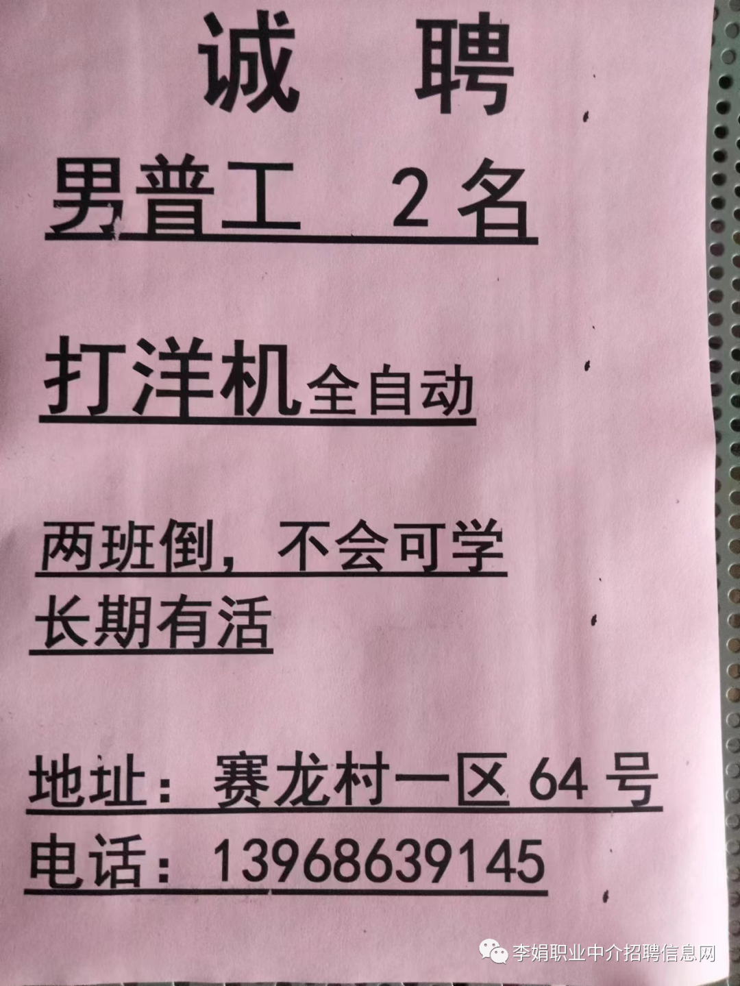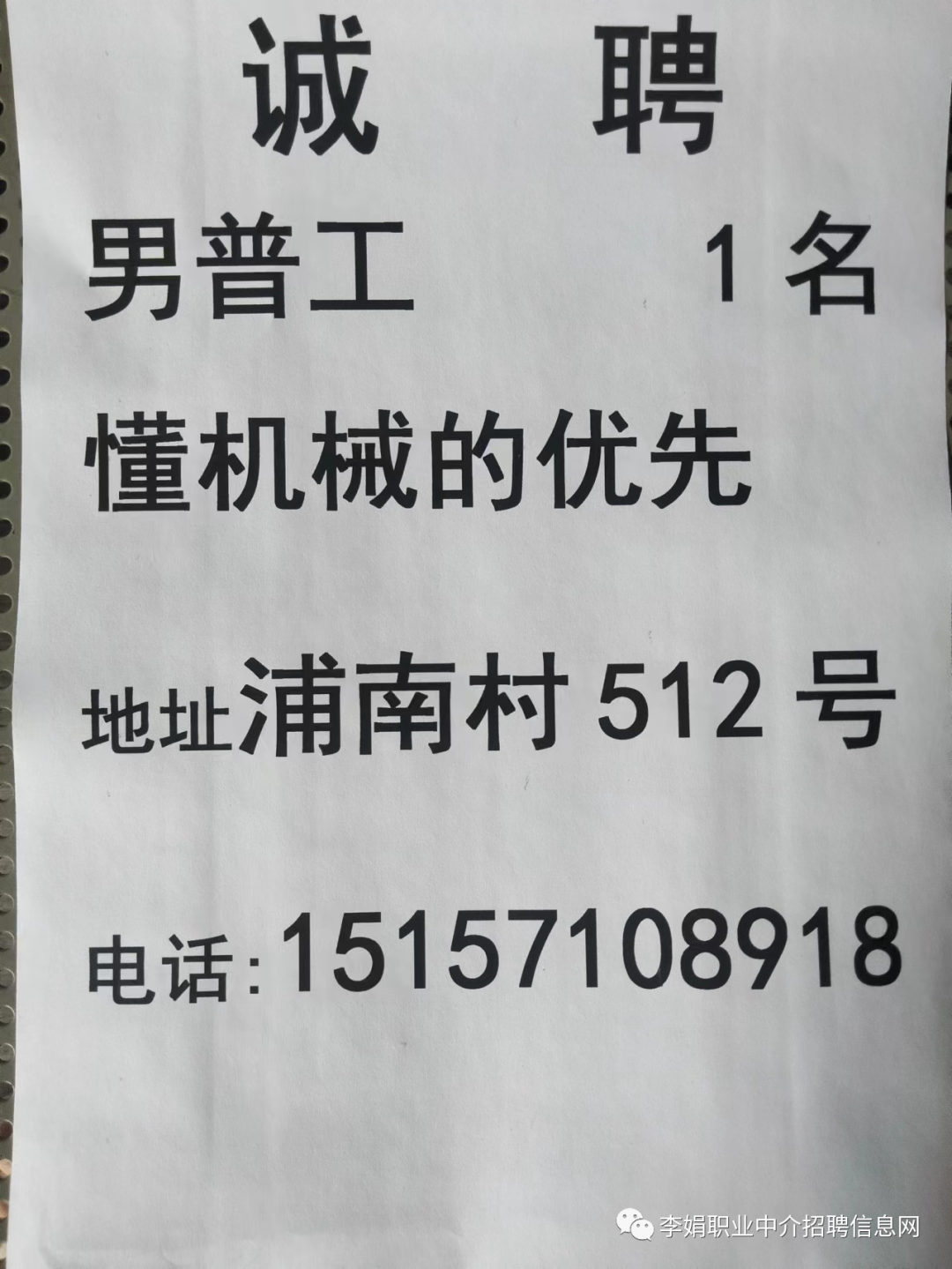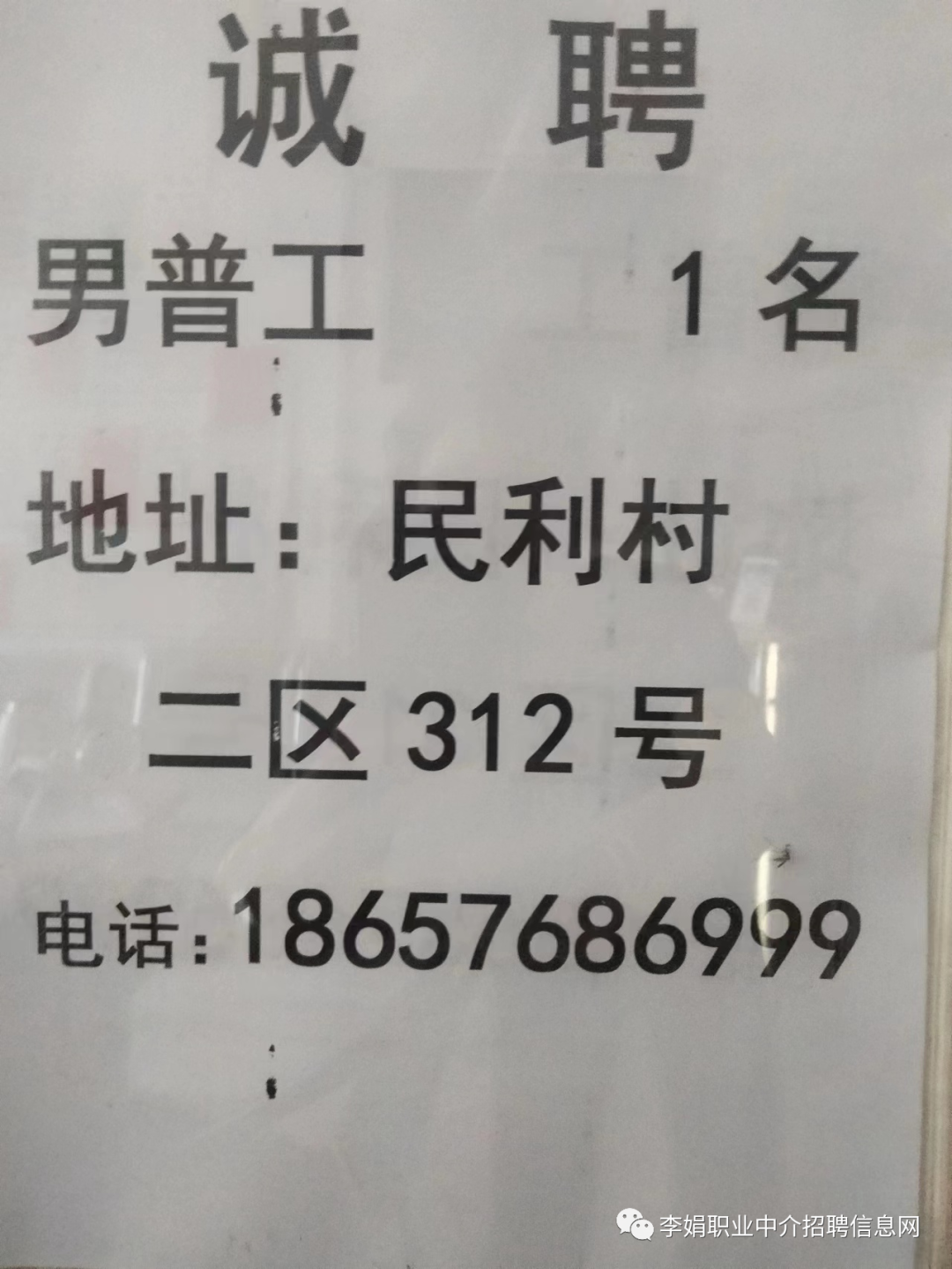 男普工 1名 地址名:民利村2区 312号 电话:18657686999