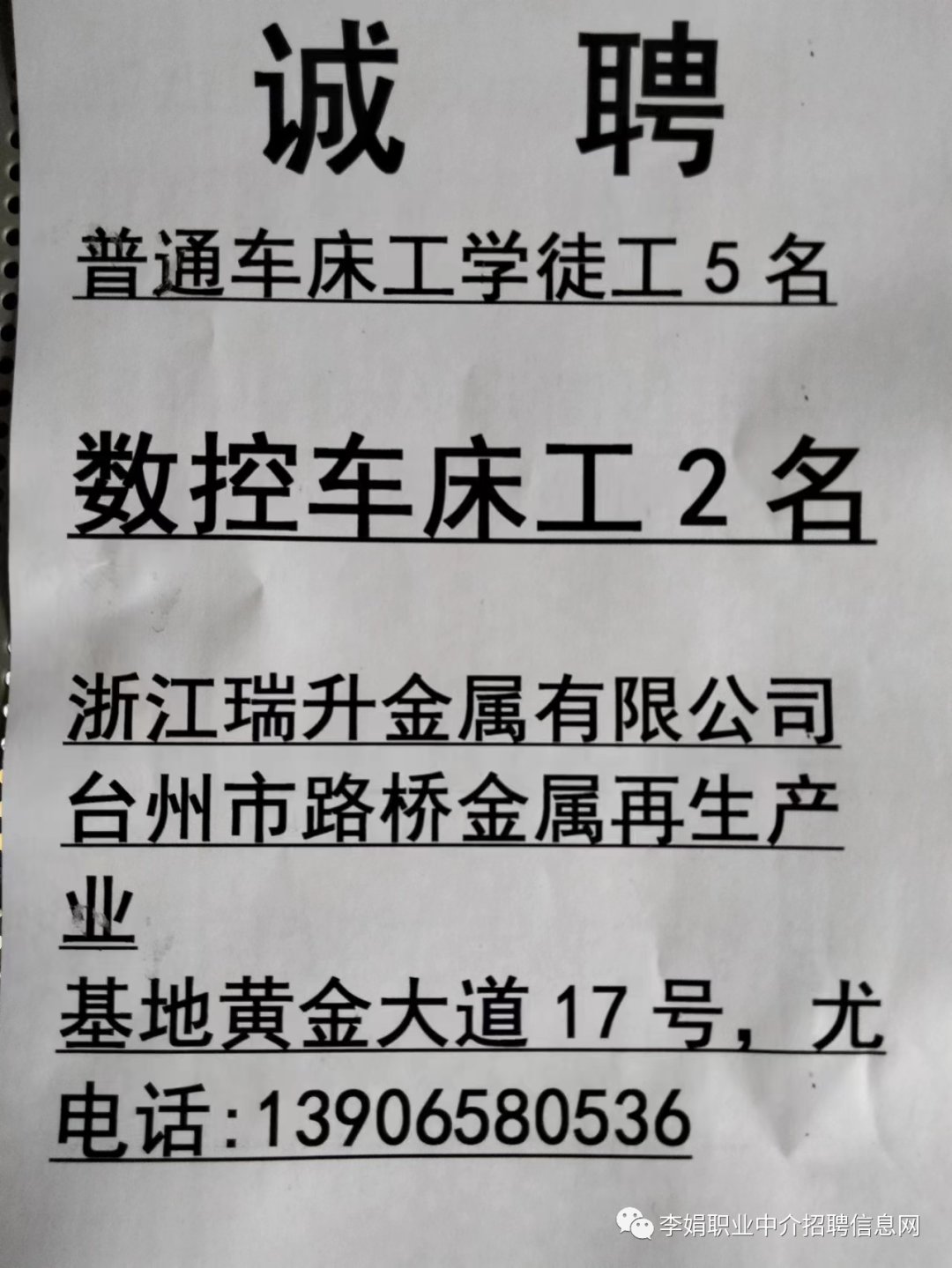 招聘数控操作工 4名 不锈钢下水与铜 夫妻工优先 电话:13819699646 地址:玉环