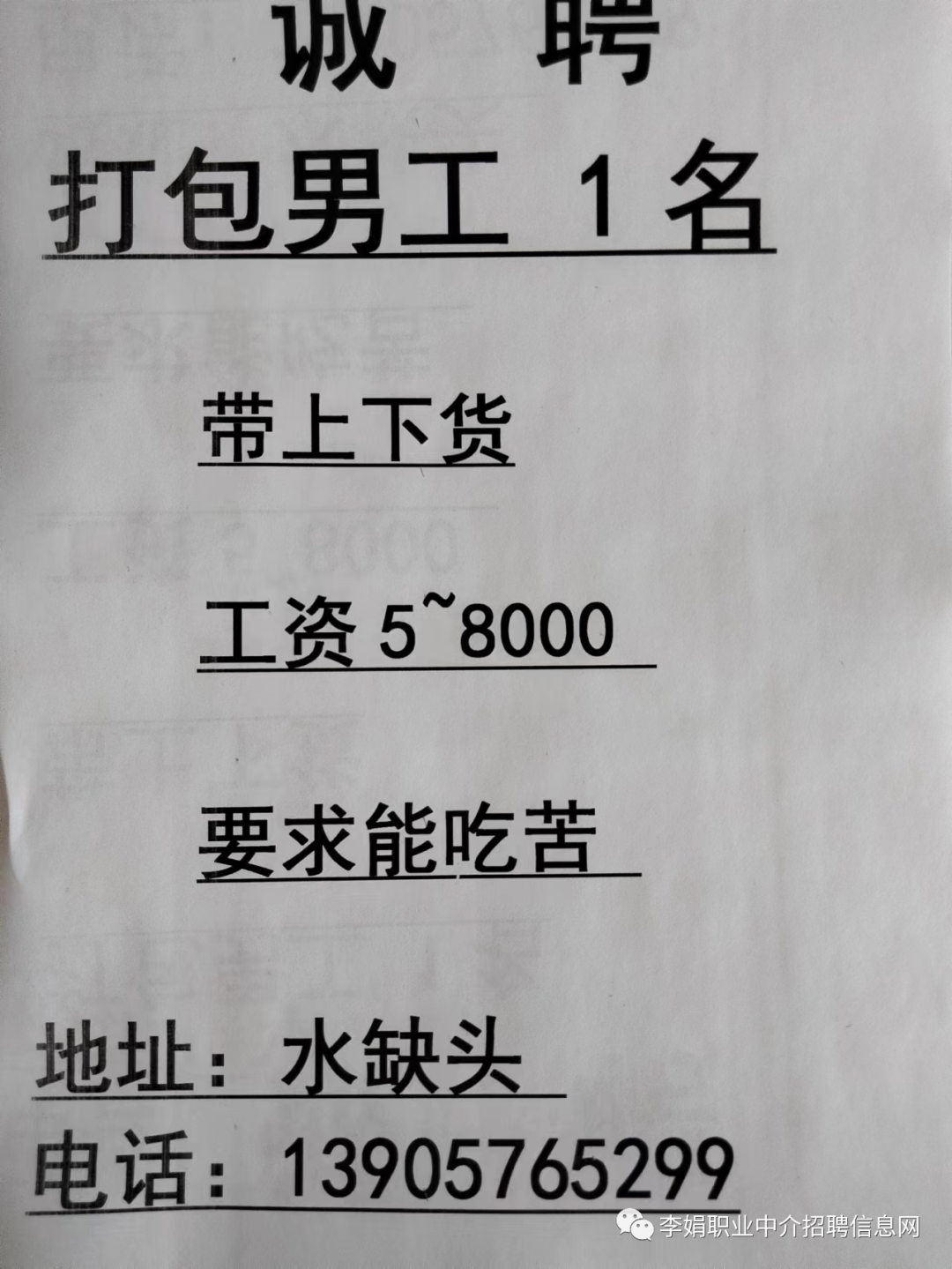 招聘:打包男工 1名 地址:徐山村 电话: 18779292406