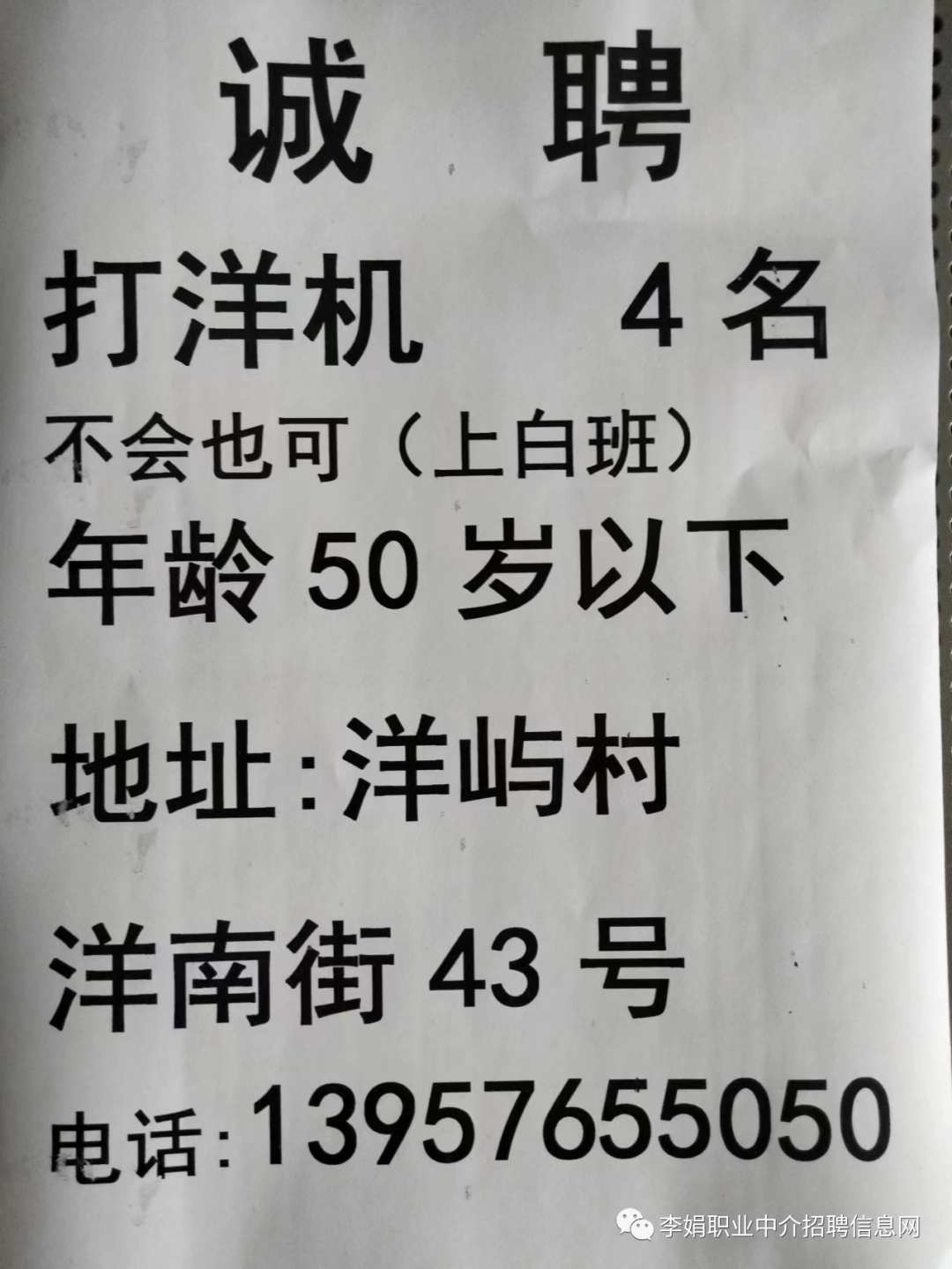 v 招工 :打洋机 2名 地址:民利村2区312号 电话:18657686999