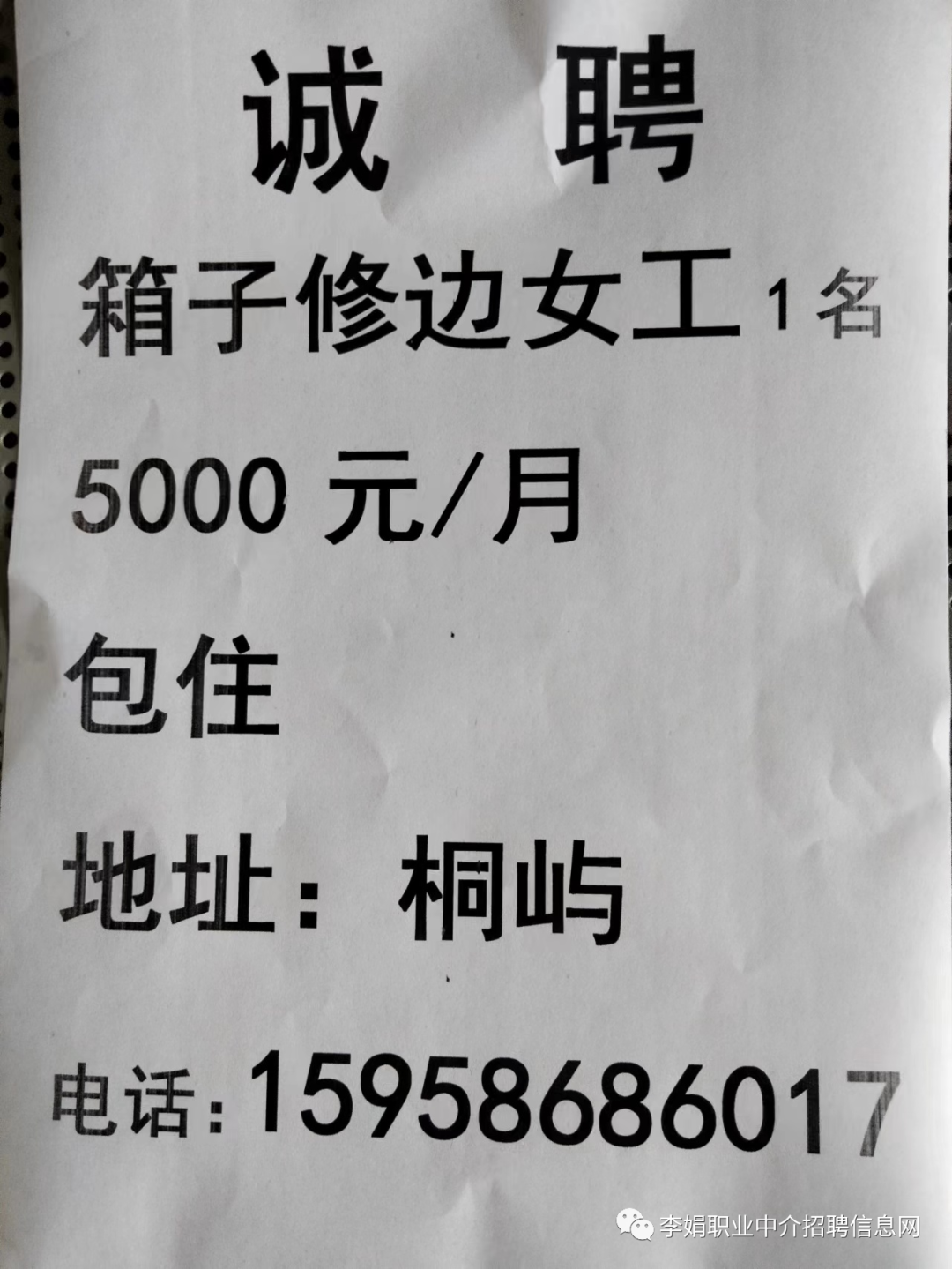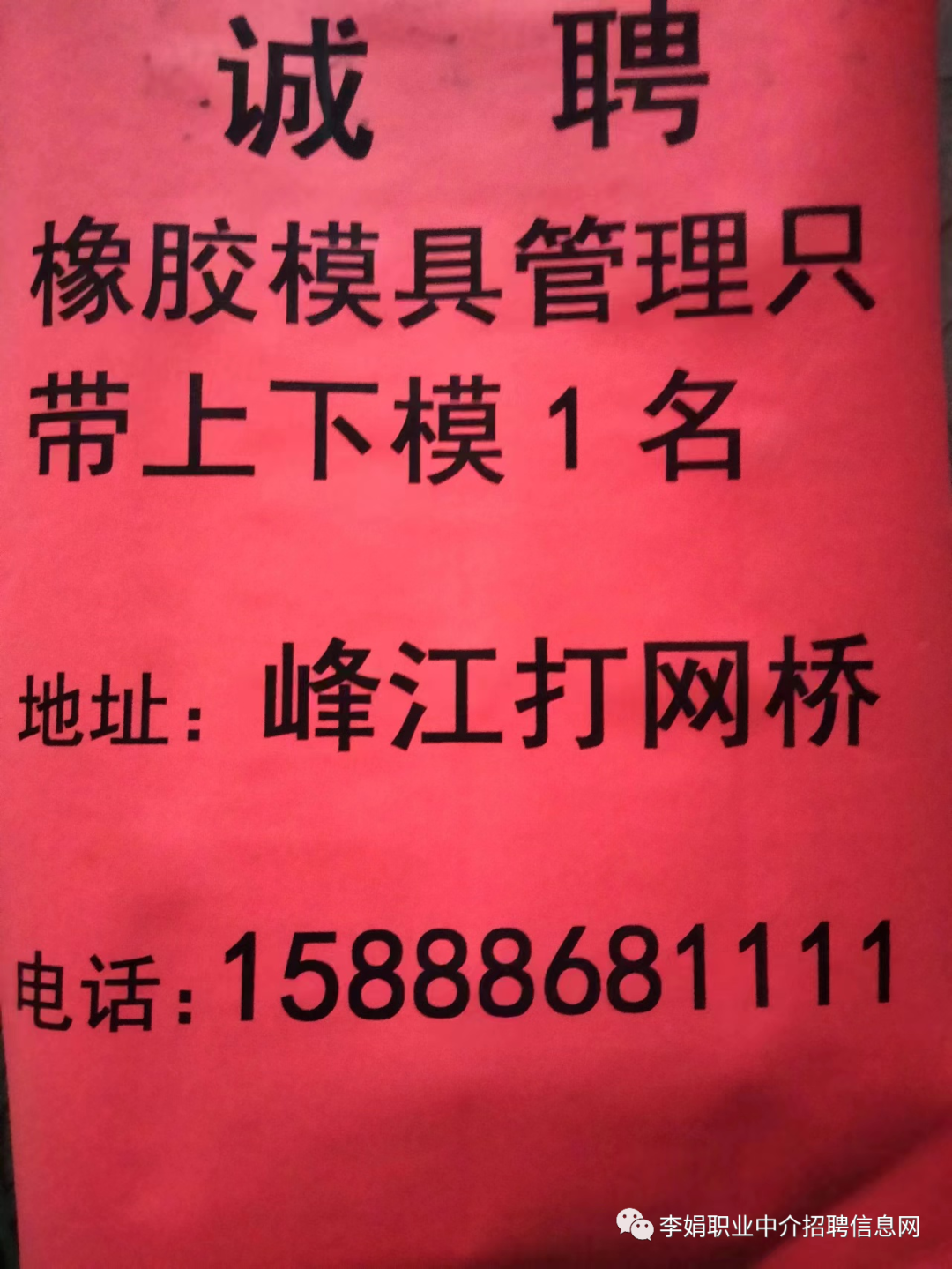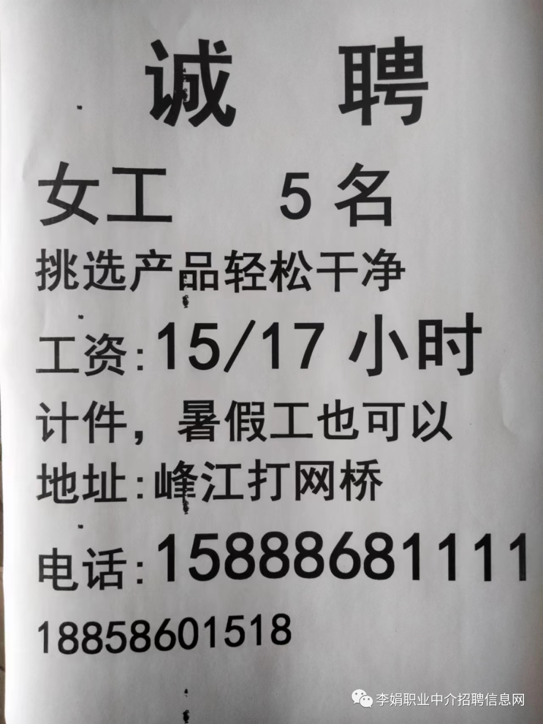 招聘:普工2名 有住宿 有卫生间 地址:峰江 电话:15888681111