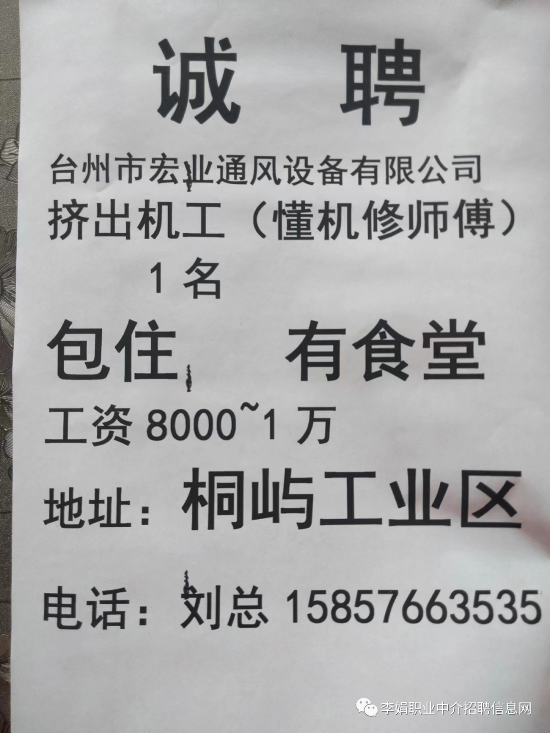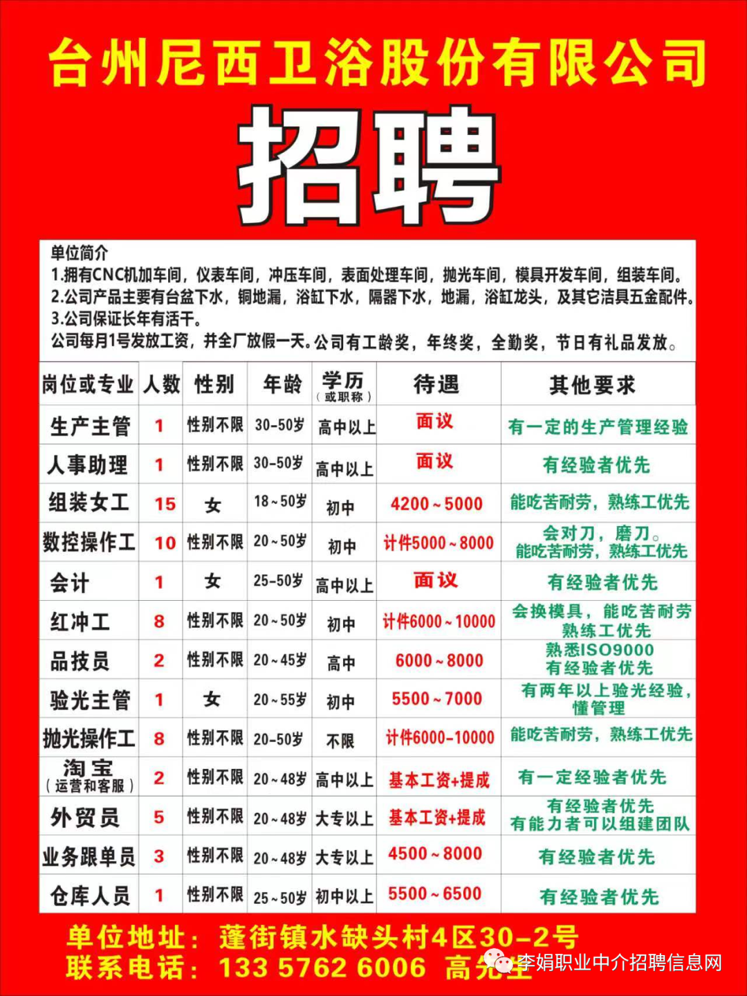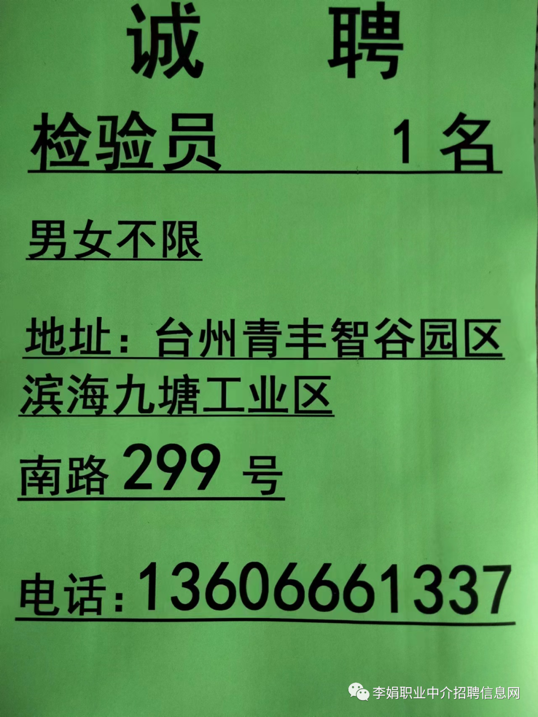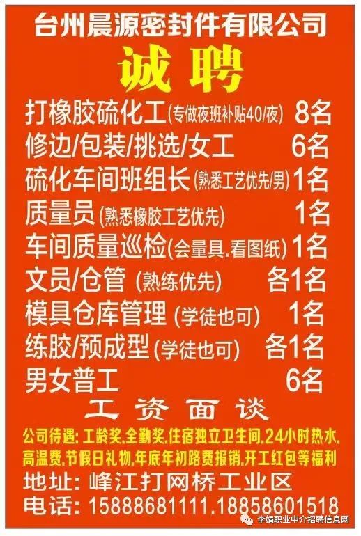招聘:采购,出纳2名 地址 :温岭东部新区 电话:13185765318