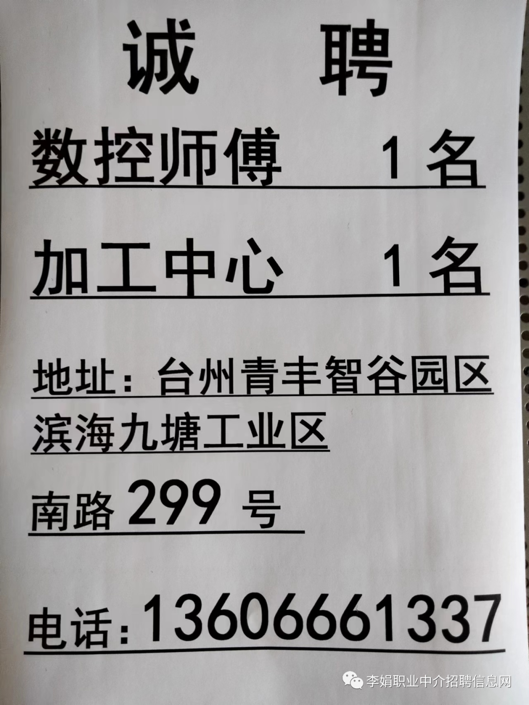 招聘:数控师傅 2名 地址 :滨海工业区 电话:13173700088