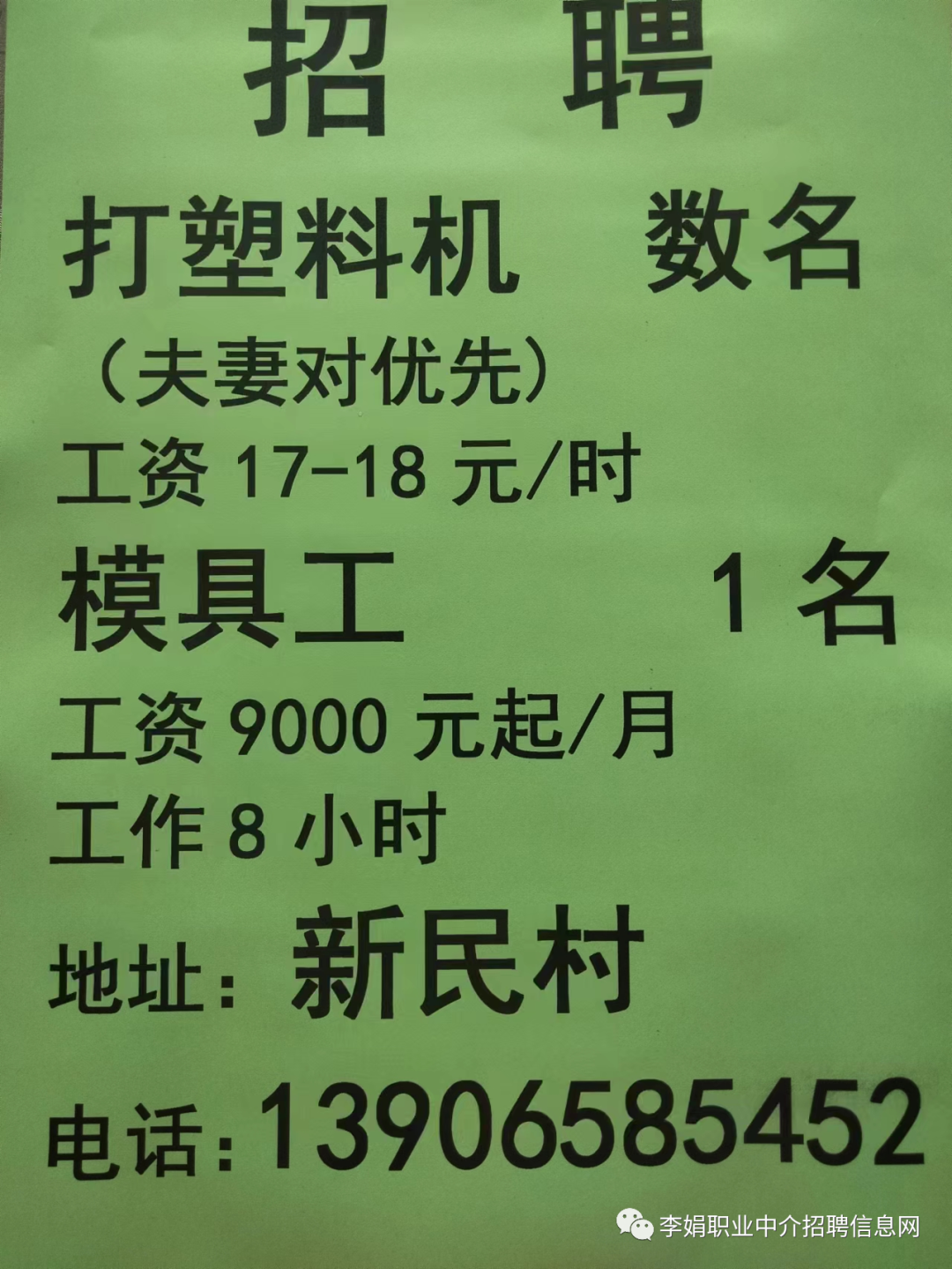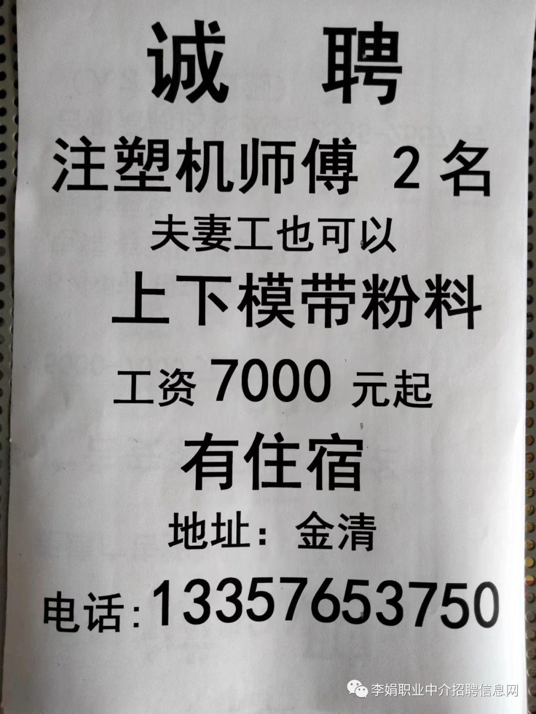 招工,打塑料机夫妻对 要求年龄45岁以内 工资17每小吋 12小吋倒班 电话:82759299
