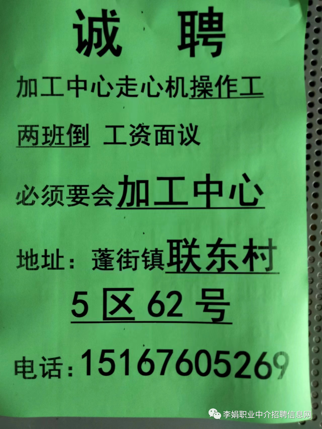 招聘 :加工中心学徒工2名 地址:日升1区37号 电话:13606687439