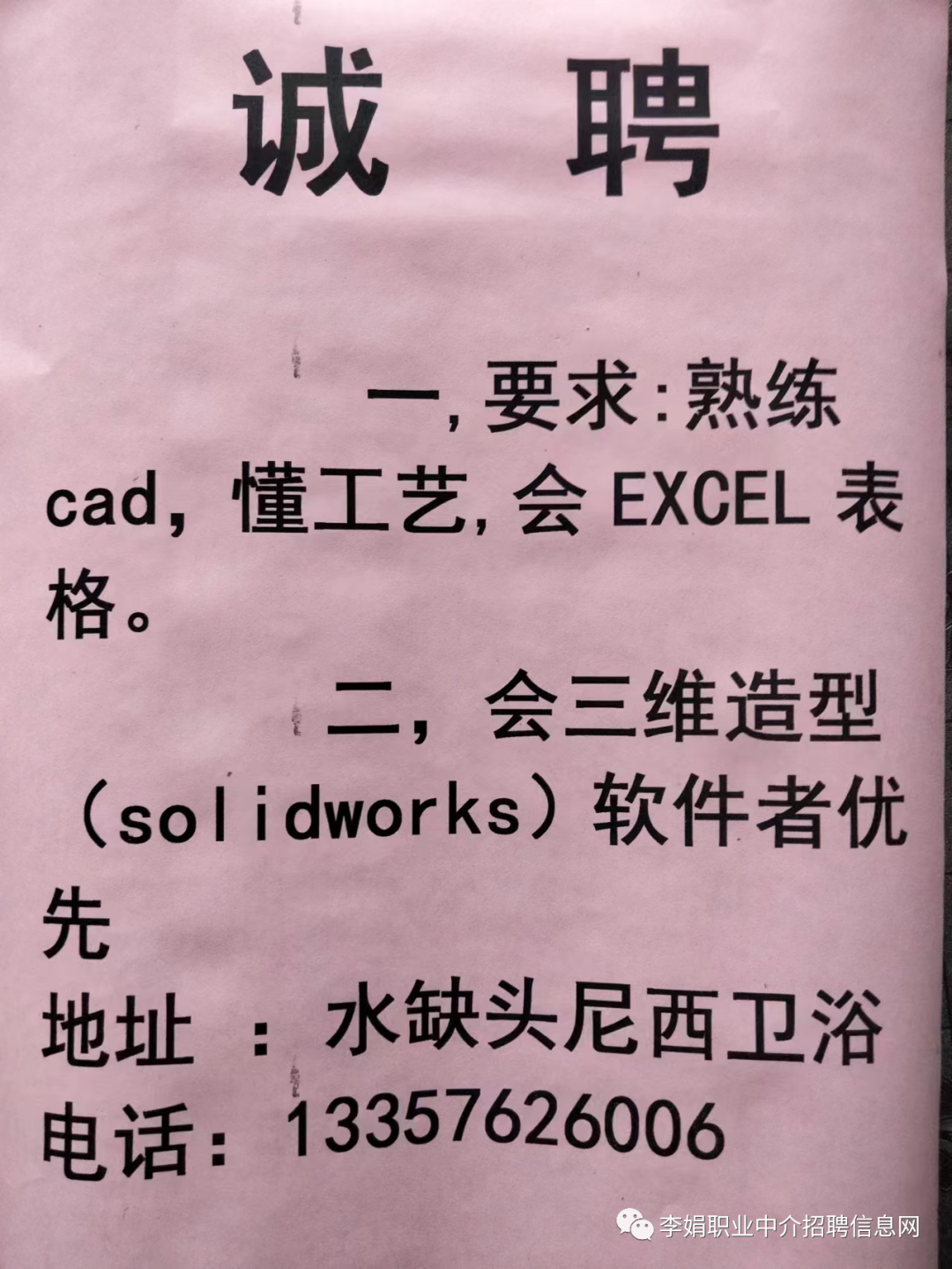 招聘 :三维设计师 1名 女工接线 1名 机械装配学徒 5名 (有工作经验的优先) 地址: 金清卷桥工业区 电话:15968691767