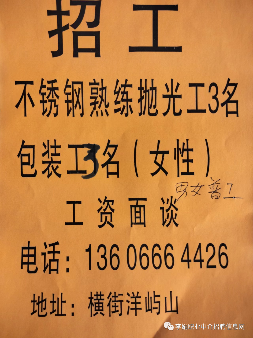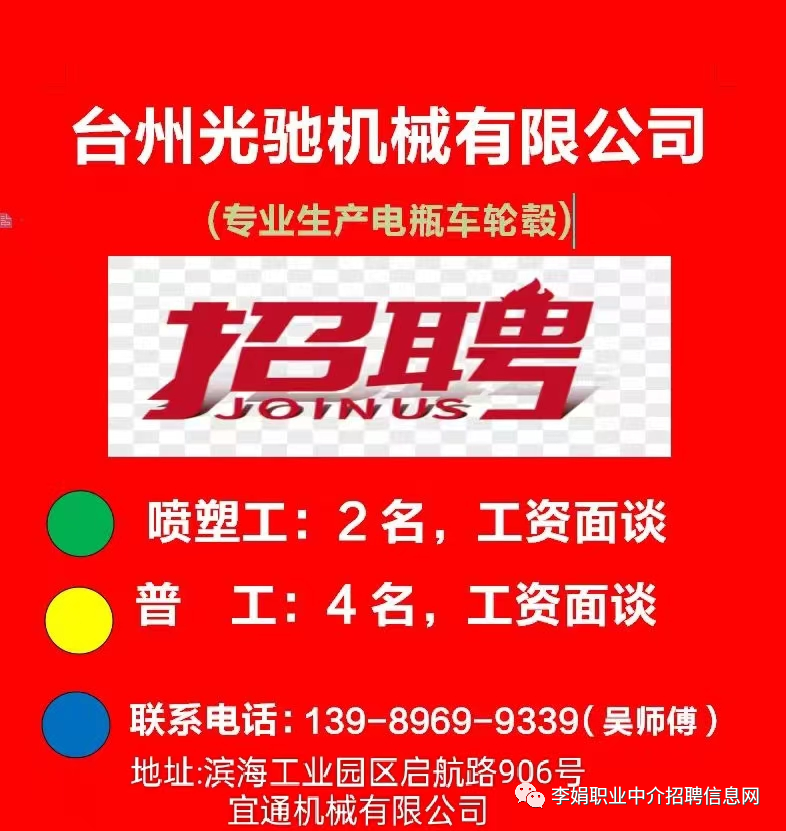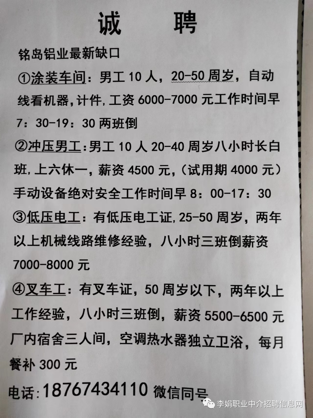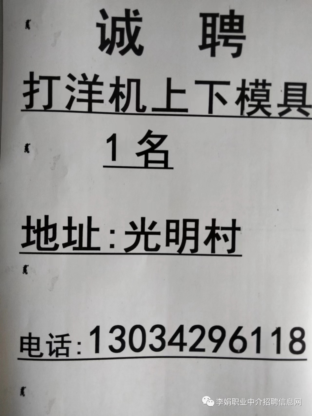 1️⃣圆片:计件工资6500-8000元 2️⃣冲压工:白班6000男女不限 3️⃣涂装车间:自动线看机器,可坐可站计件工资6000-7000元 4️⃣氧化车间:挂件女工可坐可站,综合薪资5600-6000元 5️⃣低压电工:八小时三班倒薪资7000-8000元 6️⃣机修师傅:八小时三班倒 6500-8000元 7️⃣叉车工:成手薪资6000-7000元12小时两班倒 电话18767434110微信同号 急招:小货司机1名 安装女工2名 地址 :光明村 电话:13034296118