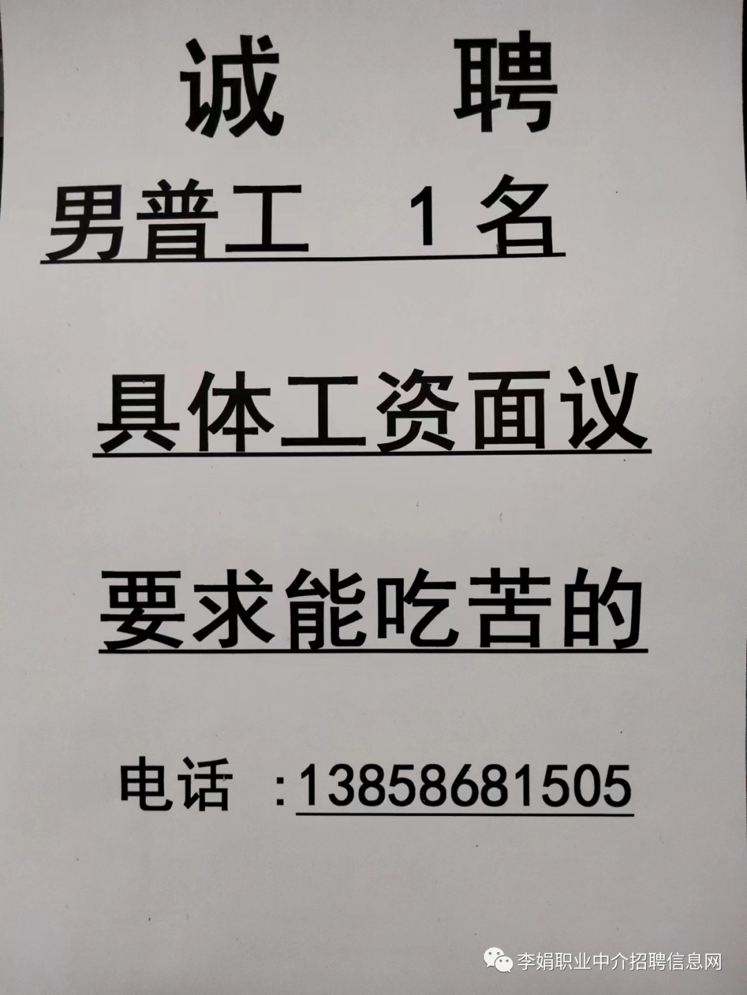 急招:男普工1名 地址 :光明村 电话:13034296118