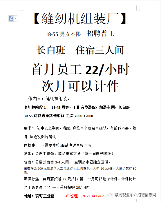 温岭电子厂 生产组装路由器 1.招聘长期工,女工,(男工满了)16~~35周岁,初中以上文化。 2.两班倒为主。工作可坐可站。 3.每小时18元,包吃工作餐,住宿4~6人间,宿舍押金100元,做满3天退还。 4.每月扣个人商业保险60元。 5.综合工资5000~~6000,次月底发工资 6.空调车间环境非常好,冬暖夏凉,避暑的好地方。 7.厂里需求长期稳定的员工,做不满七天无工资,辞职需要提前一个月申请。 联系电话,18005769320