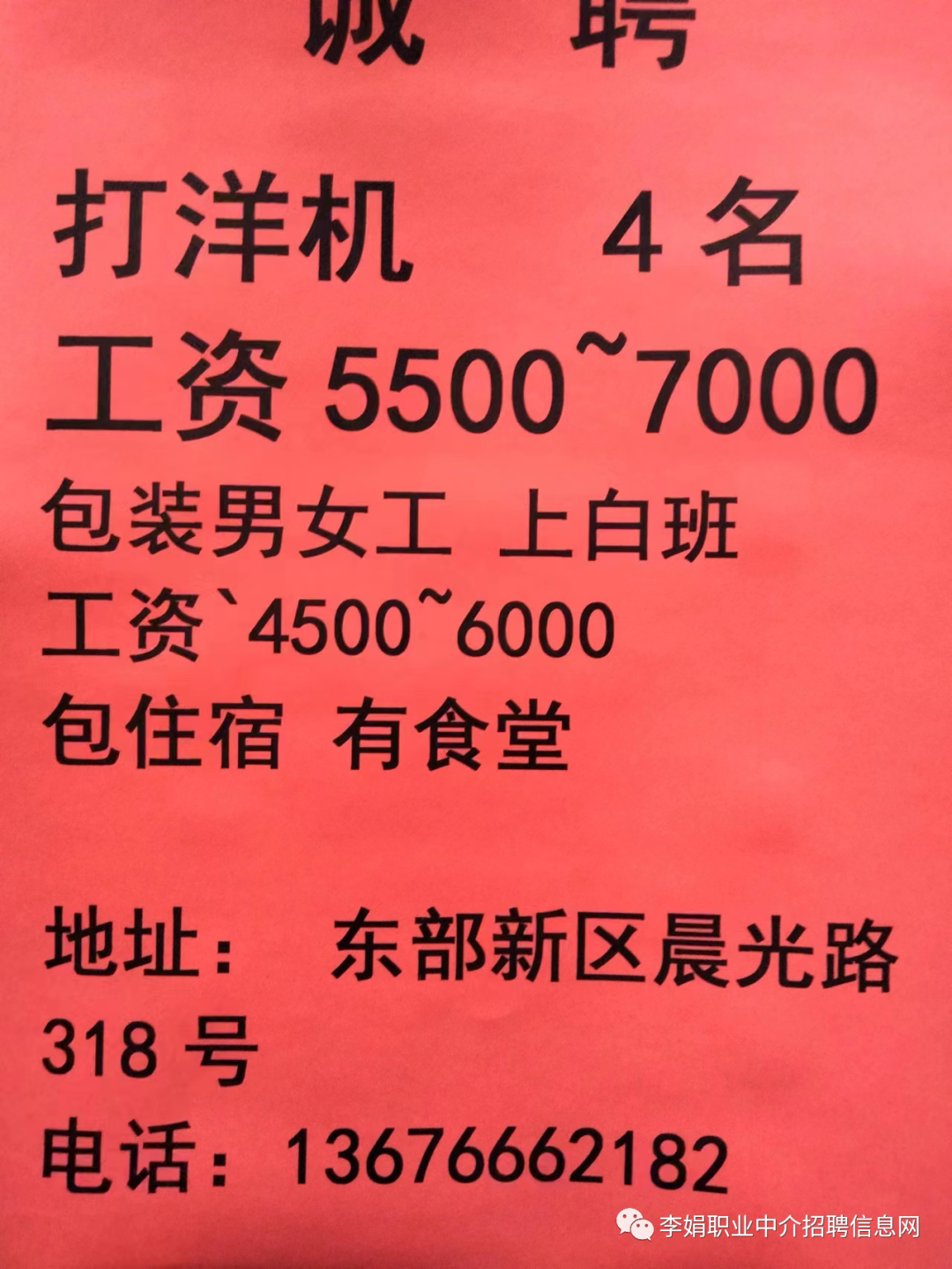 招聘:包装工,夫妻工优先,50岁以下,计件 工资5000-6500/月,不休息一直有活干 打样机 工人 数名,熟练工优先,55岁以下 电话:13676662182