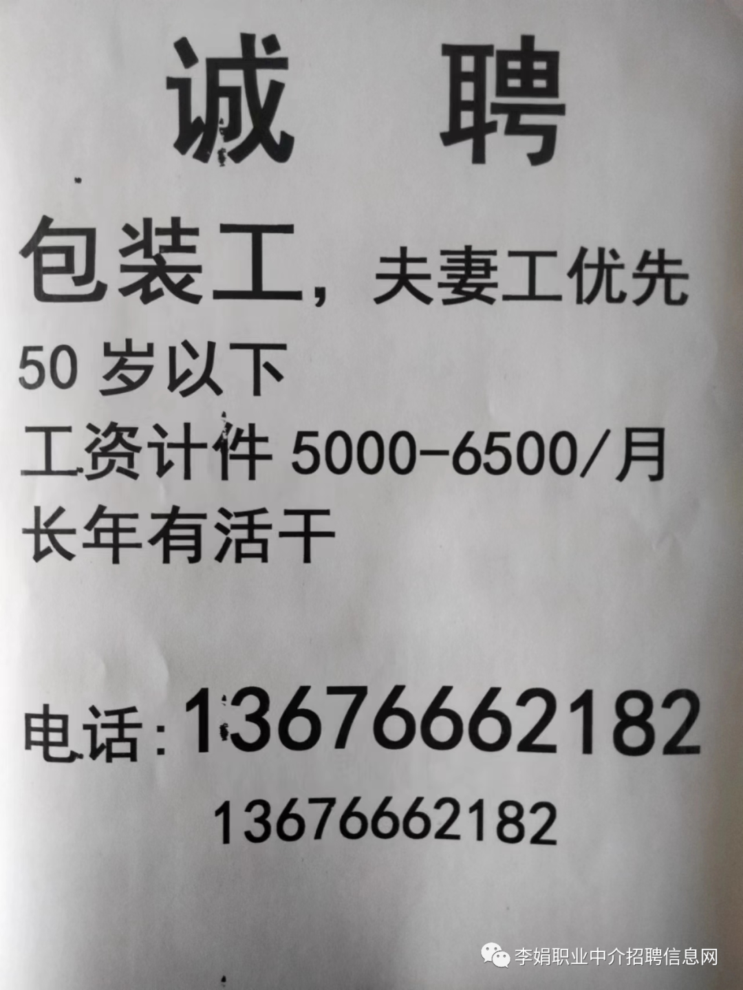 招聘:包装工5名 夫妻工优先 临时工,暑假工要 50岁以下,计件,工资5000-6500/月 长年有活干 电话:13676662182 13676662182