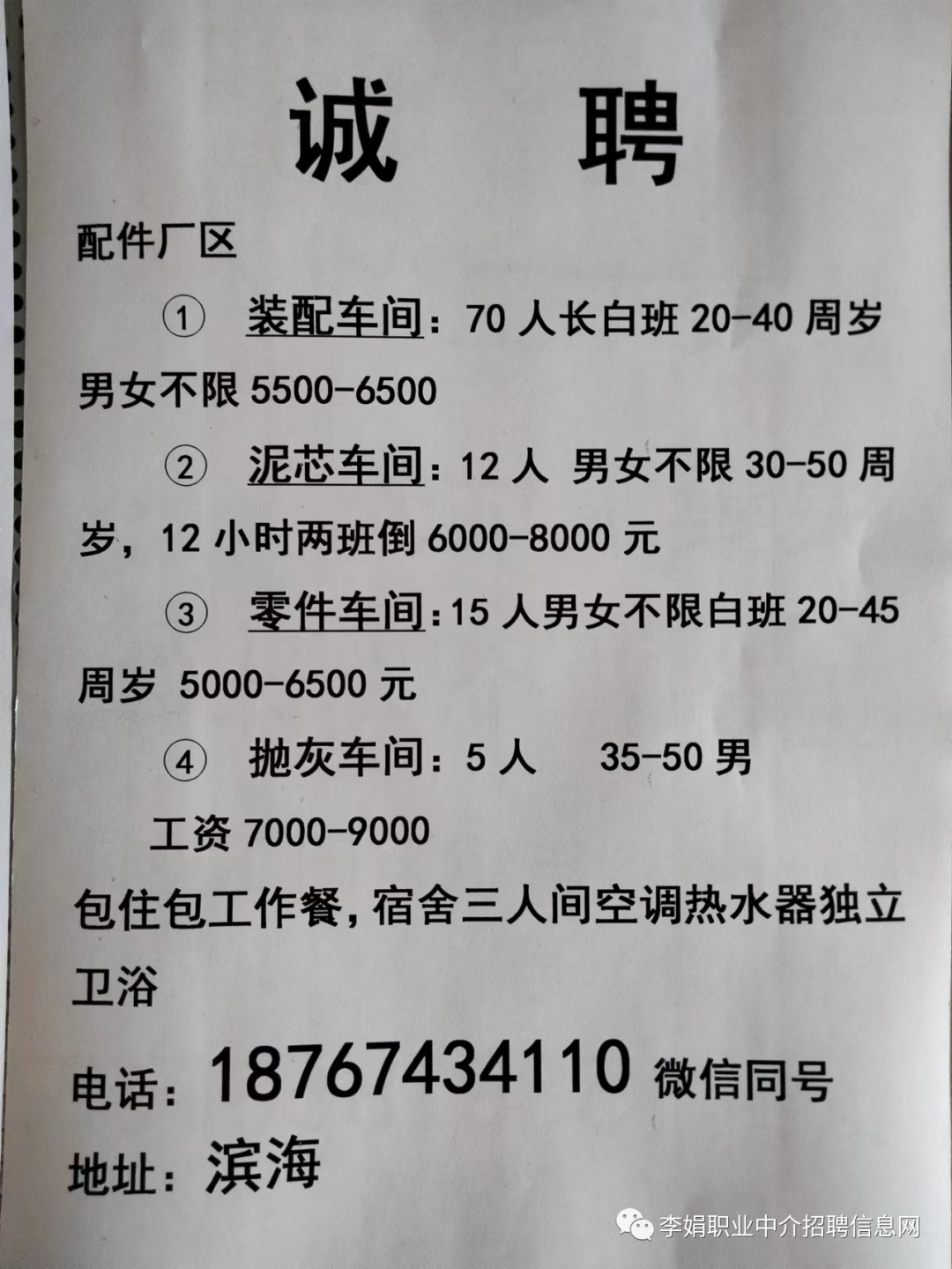 打磨抛光:男工52周岁以下计件工资8000-13000包住包两餐 造型工长夜班7000-12000元 包住包两餐 金工钻床铣床男工10人50周岁以下,12小时两班倒6000-8000包住包两餐 地址:滨海工业区 电话18767434110