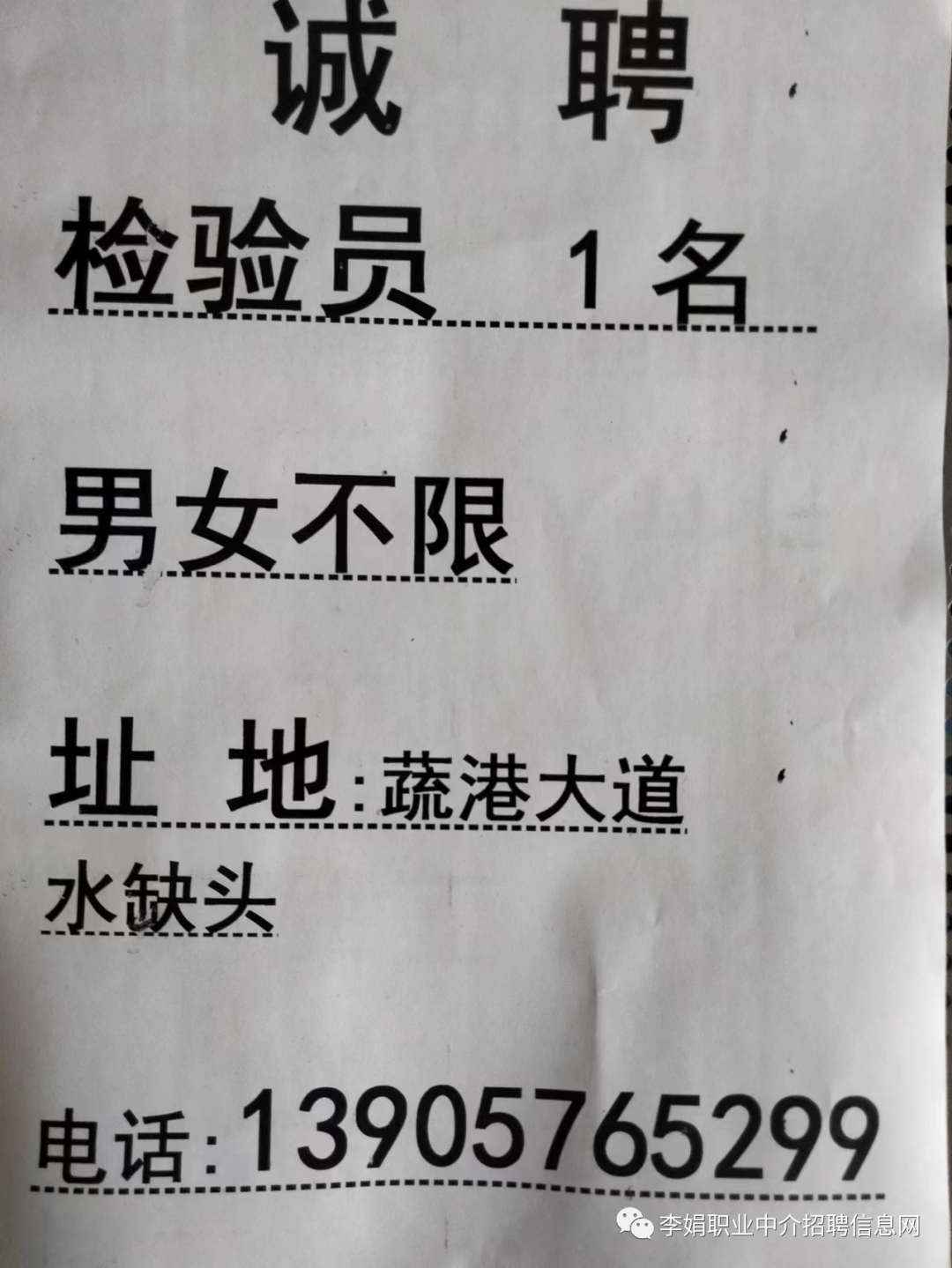 招聘男女普工 2名 年龄35岁左右 地址:滨海海丰路 电话:13173700088