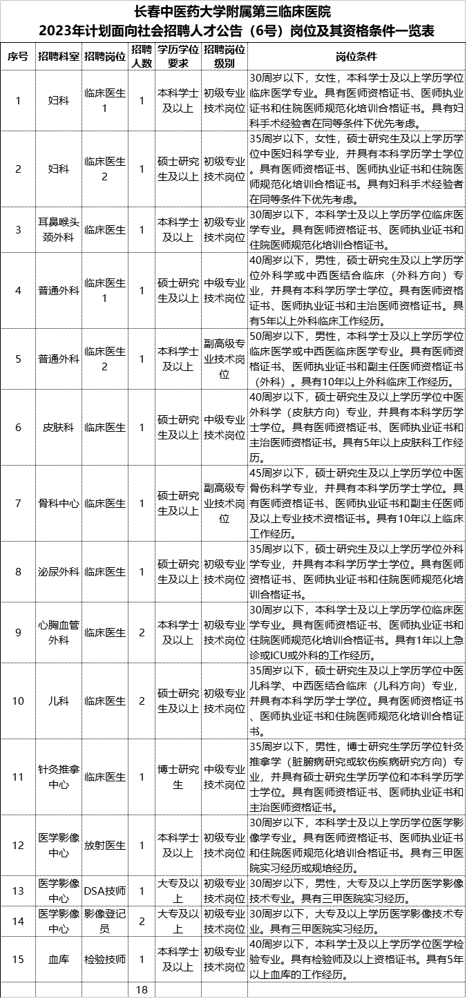 长春中医药大学附属第三临床医院是一所集医疗、教学、科研于一体的三级现代化中医综合医院。医院占地面积约1.93万平方米,总建筑面积8.35万平方米,编制床位700张。采用“大专科、小综合”为发展模式,实现与吉林省现有医疗机构差异化发展。院内设有脑病中心、骨科中心、儿科、心血管内科(心脏康复中心)、肺病科、肾病科、妇科、口腔治疗中心、综合外科、麻醉科·手术室、重症监护病房(ICU)、内分泌代谢病科、消化病科、针灸推拿中心、风湿科、心病科、眼科、疼痛科、耳鼻喉头颈外科、皮肤科、急诊中心、健康管理(体检)中心、感染性疾病门诊等23个临床科室和医学影像中心、超声科、医学检验中心、血库、介入治疗中心、内镜诊断治疗中心、病理科、神经电生理室等8个医技科室。 根据医院发展建设规划,为持续推进人才兴院、人才强院战略,培养造就一支医德高尚、业务精湛、结构合理、充满活力的高素质专业化创新性人才队伍,结合各部门岗位需求情况,现面向社会广纳人才,有关事宜公告如下: 本次公告共招聘合同制工作人员18名。具体招聘岗位及条件详见附件1。5.35周岁以下(1987年9月18日至2005年9月18日期间出生)。获得博士研究生学历人员年龄可放宽至40周岁以下(1982年9月18日至2005年9月18日期间出生)。招聘岗位对年龄有特殊要求的(例如30周岁以下:1992年9月18日至2005年9月18日期间出生),按招聘岗位要求确定。年龄计算时间点均以9月18日为准(以本人身份证出生日期为准)。符合岗位资格条件的2023年普通高校应届毕业生报考不受年龄限制。符合岗位所需要的学历、专业、工作经历等其他条件,详见附件1。1.定向、委培应届毕业生报考,须征得定向、委培单位同意;2.招聘岗位条件要求普通高中起点。具有中级及以上专业技术资格的,其专业技术资格需要符合招聘单位设置的专业技术岗位系列。1.在公务员招考和事业单位公开招聘中被考试组织部门认定有严重违纪违规行为并在禁考期限内的人员;3.在读的非2023年毕业生(2024年1月1日后取得毕业证、学位证的考生不视为2023年毕业生;同时,普通高校在读的非2023年毕业生不得用已取得的学历、学位报考); 5.“三支一扶”“大学生村官”等基层服务项目人员及公务员招录、事业单位招聘等未达到现工作地、单位或岗位要求最低服务年限的人员;7.上述不得报考情形时间节点均以报名结束时间为准。本次招聘工作所有参与方以及可能影响公正的特定关系人需要回避的,参照《事业单位人事管理回避规定》执行。1.报名时间:2023年10月10日上午 9:00至11:30;下午13:30至15:30。报名地点:长春市净月大街1643号长春中医药大学附属第三临床医院中厅3楼302室1.报名者须填写并携带《2023年长春中医药大学附属第三临床医院招聘工作人员报名表(6号)》(附件2,从网上下载打印填写);2.请携带本人有效身份证;普通高中毕业证;各个阶段(本科、硕士、博士)的学历证书和学位证书;医师资格证、医师执业证、住院医师规范化培训合格证书和职称证等岗位需求的证件;工作经历证明(在职证明或社保缴费明细证明)等。以上证件原件、复印件各一份。原件现场审核后返还本人,复印件留存;3.报名人员各个阶段(本科、硕士、博士)学信网上的《教育部学历证书电子注册备案表》和《教育部学籍在线验证报告》;4.报名人员近期(6个月内)正面1寸免冠照片1张(贴在附件2报名表上);5.2023年毕业生尚未取得学历学位证的,须提供由本校毕业生就业指导部门签署意见的毕业生就业推荐表;若报名人员为留学回国人员,除需提供上述材料外,还须提供国家教育部留学人员服务中心出具的《国外学历学位认证书》;7.请报名人员在规定时间内到指定地点进行报名,逾期不再受理;8.报名人员应如实提交有关信息、材料及联系方式,凡本人填写信息不真实、不完整或填写错误的,责任自负;弄虚作假的,一经查实即取消考试资格或聘用资格。9.请考生确保报名时所留联系电话畅通,以便通知有关事宜。10.报名人员现场报名时因证件不全导致报名失败,后果自负。医院成立资格审查小组,对报名人员进行资格审查。依据招聘岗位设置的条件进行资格审查。其中,专业条件主要依据教育部发布的《职业教育专业目录(2021年)》《普通高等学校本科专业目录(2023年) 》《普通高校本科专业目录新旧专业对照表(2012年)》《研究生教育学科专业目录(2022年)》《全国技工院校专业目录(2018年修订)》以及综合参考“研招网—专业知识库”等相关目录审核,目录未涵盖的专业,根据实际情况由有关方面共同研究确认。1.考生只能用第二代身份证报名,对使用第一代身份证报名或考试的视为无效。2.考生应对提交的信息和材料的真实性负责,对恶意报名扰乱报名秩序或编造虚假信息骗取报名资格的,一经查实,取消考试资格或聘用资格。4.招聘岗位所要求的工作经历的计算截止时间点为2023年9月份,即到2023年9月份累计工作时间每达到12个月计为1年(普通高校在读期间不能视为工作经历进行累计计算)。其中,在校期间的社会实践(实习)经历,不能视为工作经历。考试采取笔试、技能操作考试、面试相结合的方式进行。考试将采用现场等形式由医院组织实施。具体考试安排将在官网公布或进行电话通知,请报名通过人员所留电话号码准确无误并保持畅通。考试结