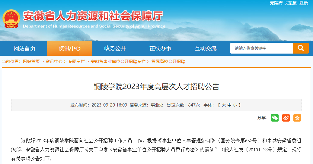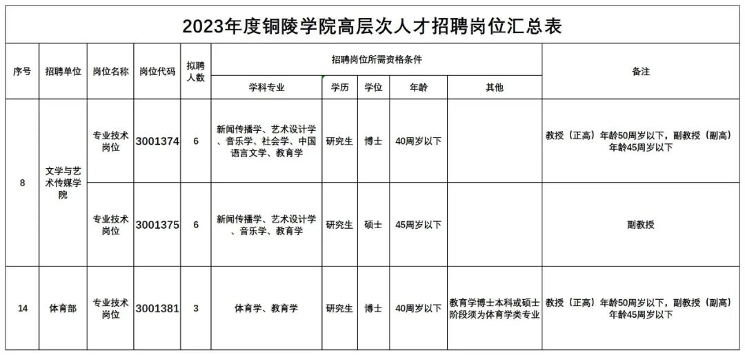 (以上为不完全数据统计,截选自岗位一览表,具体详见官网招聘岗位及要求表) 报名时间: 不受报名时间的限制,常年招聘 招聘详情网址: https://hrss.ah.gov.cn/zxzx/ztzl/ahsszsydwgkzpzl/ssgxgkzp/8782716.html 官方公告原文如下:![]() 铜陵学院2023年度高层次人才招聘公告 为做好2023年度铜陵学院面向社会公开招聘工作人员工作,根据《事业单位人事管理条例》(国务院令第652号)和中共安徽省委组织部、安徽省人力资源社会保障厅《关于印发〈安徽省事业单位公开招聘人员暂行办法〉的通知》(皖人社发〔2010〕78号)规定,现将有关事项公告如下: 一、招聘原则 (一)坚持面向社会、公开招聘。 (二)坚持考试考察、择优聘用。 二、招聘计划 具体招聘岗位计划见附件。 三、相关待遇 详见《铜陵学院2023年度高层次人才招聘公告》(网址: https://rsc.tlu.edu.cn/2023/0117/c3154a86230/page.htm)。 四、人才标准 详见《铜陵学院2023年度高层次人才招聘公告》(网址: https://rsc.tlu.edu.cn/2023/0117/c3154a86230/page.htm)。 五、招聘条件 招聘对象为符合招聘岗位条件的人员,且必须符合以下条件: (一)具有中华人民共和国国籍; (二)遵守宪法和法律; (三)具有良好的品行; (四)岗位所需的专业或技能条件; (五)适应岗位要求的身体条件; (六)岗位所需的其他条件。 博士年龄须在40周岁以下,即“1983年1月1日(含)后出生”。对具有博士学位的副教授(副高),年龄须在45周岁以下,即“1978年1月1日(含)后出生”。具备正高职称人员年龄须在50周岁以下,即“1973年1月1日(含)后出生”。业绩条件突出者,经学校集体研究后,年龄可适当放宽。 有下列情形之一的人员,不得报考: (一)不符合岗位招聘条件的人员; (二)在读的全日制普通高校非应届毕业生; (三)现役军人; (四)在各级各类事业单位公开招聘中因违反《事业单位公开招聘违纪违规行为处理规定》被记入事业单位公开招聘应聘人员诚信档案库,且记录期限未满的人员; (五)曾因犯罪受过刑事处罚的人员和曾被开除公职的人员、受到党纪政纪处分期限未满或者正在接受纪律审查的人员、处于刑事处罚期间或者正在接受司法调查尚未做出结论的人员; (六)按照国家、省有关规定,尚在最低服务年限内的机关、事业单位正式在编工作人员; (七)法律法规规定不得参加报考或聘用为事业单位工作人员的其他情形人员。 报考者不得报考聘用后即构成《事业单位人事管理回避规定》第六条所列情形的岗位。 六、招聘程序 (一)报名 应聘者采取网上报名。应聘人员须提供的自荐材料:下载并填写《铜陵学院应聘人员简明情况表》(在人事处网页“下载专区”栏下载),附学历学位证书、主要业绩成果、身份证复印件。自荐材料电子版发送至zp10383@tlu.edu.cn邮箱。邮件主题格式:姓名+学历(专业或职称)+应聘部门名称。自荐材料须客观真实,不得弄虚作假。 我校招聘的高层次人才,不受报名时间的限制,常年招聘。 (二)资格审查 对应聘者所投递的自荐材料进行资格审查。学校人事处和各用人院部主要审查应聘者的应聘资格,包括年龄、专业、学习经历、工作经历、业绩成果以及相关证书等材料。资格审查通过后,以电子邮件或电话通知应聘者参加考核考试的时间和地点。资格审查贯穿于招聘工作全过程,如招聘过程中任何环节发现有弄虚作假行为的,随时取消应聘资格或予以解聘。 (三)考核考试 由各院部组成高层次人才引进考核小组负责对应聘的高层次人才进行考核。考核小组成员不少于7人,包括院部党政负责人、教研室主任和相关学科专家。院部纪检人员须全程参与监督。引进高层次人才可简化考核程序,教授(正高)进行面试,博士(后)进行试讲和面试。对应聘者可进行线上考核。院部对应聘者进行考核的有关材料须整理完善后归档备查。 应聘教授(正高)岗位的,面试成绩占综合成绩的100%,面试结束后,考核组现场评议打分并给出最终成绩。应聘博士、博士学位副教授(副高)及副教授(副高)岗位的,试讲占综合成绩的70%,面试占综合成绩的30%,考核组现场评议进行综合打分并给出最终成绩。考核成绩以百分制计算,成绩计算时保留到小数点后两位,总成绩不得低于75分。考核结束后,根据招聘计划数和应聘人员最终成绩,从高分到低分,按1:1比例等额确定进入体检、考察对象。 (四)体检考察 1.体检工作按照人力资源社会保障部、国家卫生计生委、国家公务员局《关于修订〈公务员录用体检通用标准(试行)〉及〈公务员录用体检操作手册(试行)〉有关内容的通知》(人社部发〔2016〕140号)和省委组织部、省人力资源社会保障厅、省卫生厅《关于进一步规范全省事业单位公开招聘人员体检工作的通知》(皖人社秘〔2013〕208号)等有关规定执行。学校人事处通知相关体检人选到学校指定的三甲医院进行体检,并符合省级主管部门规定的体检标准。应聘人员未在规定的时间内按要求完成体检的,学校可取消其体检资格。 2.体检合格人员填写《铜陵学院拟聘用人员思想政治和师德师风个人信息表》(在人事处网页下载专区-师德师风栏下载)。相关教学院部党委(党总支)对拟聘用人员在原学习或工作单位的思想政治和师德师风进行考察,填写《铜陵学院拟聘用人员思想政治和师德师风考察表》(在人事处网页下载专区-师德师风栏下载)。党委教师工作部对二级党组织的考察程序和考察结论进行复