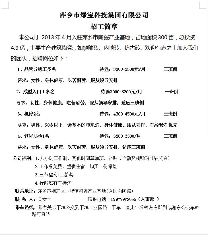 江西众一华普科技有限公司是深圳市普乐华科技有限公司的全资子公司,2020年在萍乡市湘东区建厂,一期投资金额1.3亿,占地30亩,建筑面积15000平。公司主要产品是非晶、纳米晶和金属粉芯,产品广泛应用光伏发电,新能源汽车、智能电网、变频家电等新兴行业。 因公司发展需要,现诚聘以下人员: 一、人事文员1名 岗位要求:男女不限,年龄 25-40 岁,高中或以上学历;工作仔细认真、有责任心、执行力强,有一定的抗压能力,办公软件熟练,有2年以上相关工作经验优先。 二、品检员 2 名(两班倒)转正后月薪3800-5500元/月 岗位要求:男女不限,18-40 岁,高中或以上学历;学习能力强,吃苦耐劳;具备品质检测相关工作者优先。 三、普工若干名,转正后月薪3300-5500元/月 岗位要求:视力良好,吃苦耐劳,能适应倒班。 公司福利待遇: 免费提供工作餐;一年三节发放节日福利;入职后为员工购买社保等相关保险;员工依法享有法定假期,病假、婚假、产假、丧假等; 公司地址:江西省萍乡市湘东区下埠镇陶瓷工业园(江西众一华普科技有限公司) 联系电话:19070853003(李女士) 江西安芯美科技有限公司,于2020年8月份成立,是一家集研发、生产、销售半导体集成电路于一体的高新技术企业,公司位于萍乡安源区电子信息产业园B栋,是由萍乡市安源区政府重点招商引资企业,总投资5亿元人民币,可年产20亿只先进半导体开发,封装及应用的集成电路,并拥有年产半导体集成电路TVS、MOS、ESD等集成电路60条先进生产线。因公司发展需要,现向社会诚聘以下人员: 一、操作员:(20名)(4100-5500/月) 岗位要求:初中以上学历,男女不限,年龄18-40岁,视力良好,身体健康,能适应倒班,晚班工作,能吃苦耐劳,服从管理,包食住,购买五险,月休四天,有电子厂相关工作经验者优先。 二、质检员:(5名)(4100-5500/月) 岗位要求:初中以上学历,男女不限,年龄18-40岁,视力良好,身体健康,能适应倒班,晚班工作,能吃苦耐劳,服从管理,包食住,购买五险,月休四天,有电子厂相关工作经验者优先。 福利待遇: 1、薪资:保底薪资1730 + 加班费,平时加班1.5倍,双休日加班2倍,法定节假日加班3倍,转正后购买五险。 2、待遇: 绩效奖:公司量产后以个人表现,具体产出为指标每人200-500元。 全勤奖:当月无任何请假记录奖励100元。 工龄奖:每满半年加50元。 年终红包:根据企业实际年终效益发放。 夜班津贴:上夜班每天额外增加15元。 社保福利:入职满3个月依法为员工购买五险 公司提供免费住宿,免水费。(电费平摊),食堂提供免费早中晚餐。 每年公司免费组织团建。 公司设立内部推荐奖,共700元 3、工作时间:公司实行两班轮班制(白班早8:00-晚20:00)(晚班晚20:00-早 8:00),公司设立员工晋升渠道、内部提拔工程师、技术员、主管。工厂全自动化生产设备,恒温恒湿无尘生产车间,舒适优雅。 联系方式:15079958285(袁女士) 15870855475(刘女士) 联系地址:萍乡市安源区安源工业园重庆东路2号,独栋厂房市内可从火车站坐公交16路到安源产业园下车,步行200米即可 萍乡汉和医院招聘后厨帮厨/杂工一名 要求:女性,年龄50岁及以下,吃苦耐劳。月休四天,包吃,月薪2200-2300元, 工作地址:鹅湖公园对面萍乡汉和医院 联系电话0799-7092990/15579959190 招聘:1.销售顾问3人,年龄25-40岁,薪资:底薪+提成, 2.售后车间维修技工:1人,薪资可观,都包中餐,买保险。 3.仓管:1人,年龄30-45岁,有经验者优先,包中餐,买保险。 地点:博昌家居对面利得综合楼一楼,联系电话:19907099558 1、A2驾驶员数名 2、崗位要求:证件齐全、遵纪守法、驾驶挂车经验二年以上,熟悉长株潭.娄底.邵阳.郴州.常德等地路线者优先(车型13米侧翻) 3、本公司所有货物标载、货源充足、收入稳定! 4、薪资待遇:每月准时发放、月收入轻松过万元 联系电話:15979459888胡队 就业地址:湘东区五里亭东风商务车附近 江西康胜新能源有限公司,急需招聘人员: 一、仓库管理员 要求:20岁-45岁,男性 有制造业相关工作经验1年以上,熟悉电脑和ERP系统,有责任心,懂电池行业者优先 单休,工资3000-4000元/月 二、保安 要求:男性,20岁-50岁以下,工资3000-3500元。吃苦耐劳,服从管理,上班时间12小时制,退役军人优先。 所有招聘人员要求身体健康,做事耐心细致,认真负责,服从厂部工作安排, 联系电话:谢女士 18296927590 地 址:萍乡经济技术开发区周江信息产业园A6栋 一、成型车间操作工,试用期2800-3000保底 长白班,月休4天,25-45岁(女士),初中以上学历有工厂操作工经验优先,身体健康,吃苦耐劳,住安源工业园附近人员。 二、烧窑/装窑工 各一名,4500-8000元 8-10小时,25-45岁(男士),初中以上学历有烧窑工作者优先,责任心较强,身体健康,吃苦耐劳。 地点:安源工业园吉林路 联系电话:13879943355 萍乡安源包装有限公司是一家集设计、制版、印后加工、包装生产制罐生产销售于一体的综合性大型包装印刷企业,拥有一支满创意设计,热情敬业、团队合作精神的员工队伍。现因公司发展需要,需招聘以下人员: 一、 行政人事文员1名 要求:大专学历,男女不限,40岁以下,持C1驾照; 职责:熟悉办公软件,有人事行政相关工作经验优先,具有较强的应变能力和沟通能力; 待遇:3000-5000元/月 二、仓管员1名 要求:男女不限,有仓库管理经验的优先,有责任心、上进心、工作积极主动,吃苦耐劳,年龄40岁以下; 职责:负责仓库成品的收发、记录、整理、整顿;负责发货工作;负责货品的建账工作