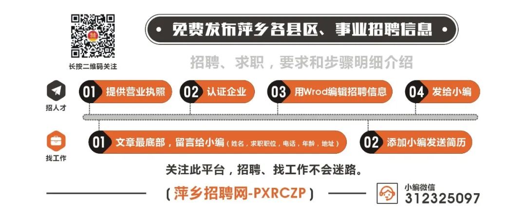 HI 需要招聘公司,添加小编微信,把招聘信息发给我 温馨提醒:本公众号平台只发布萍乡全市招聘信息 谢绝各种外包公司和外地企业及劳务公司招聘信息,谢谢! |
