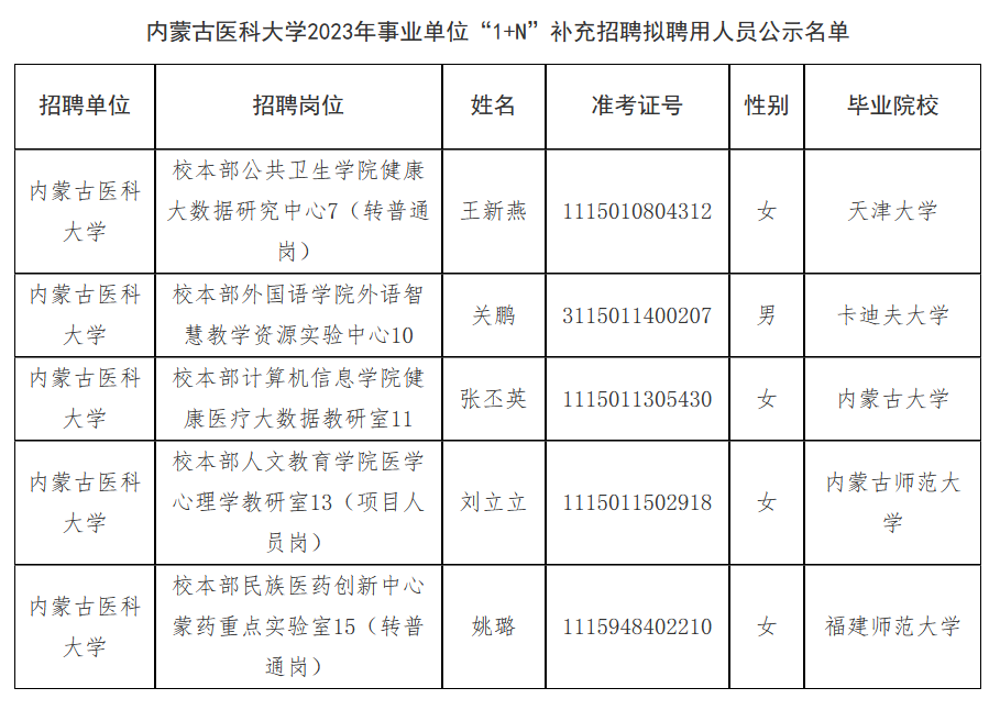 根据《2023年内蒙古自治区事业单位“1+N”补充招聘工作人员公告》和《内蒙古医科大学2023年度事业单位公开招聘工作人员公告》要求,经过笔试、面试、体检、考察,确定王新燕等5名同志为内蒙古医科大学“1+N”补充招聘拟聘用人员,现面向社会进行公示,公示期5个工作日,自2023年9月20日至2023年9月26日。欢迎社会各界对以上同志是否符合岗位招聘条件进行监督。 举报电话:内蒙古医科大学:0471-6653264 内蒙古自治区人力资源和社会保障厅:0471-694491 附:内蒙古医科大学2023年事业单位“1+N”补充招聘拟聘用人员公示名单