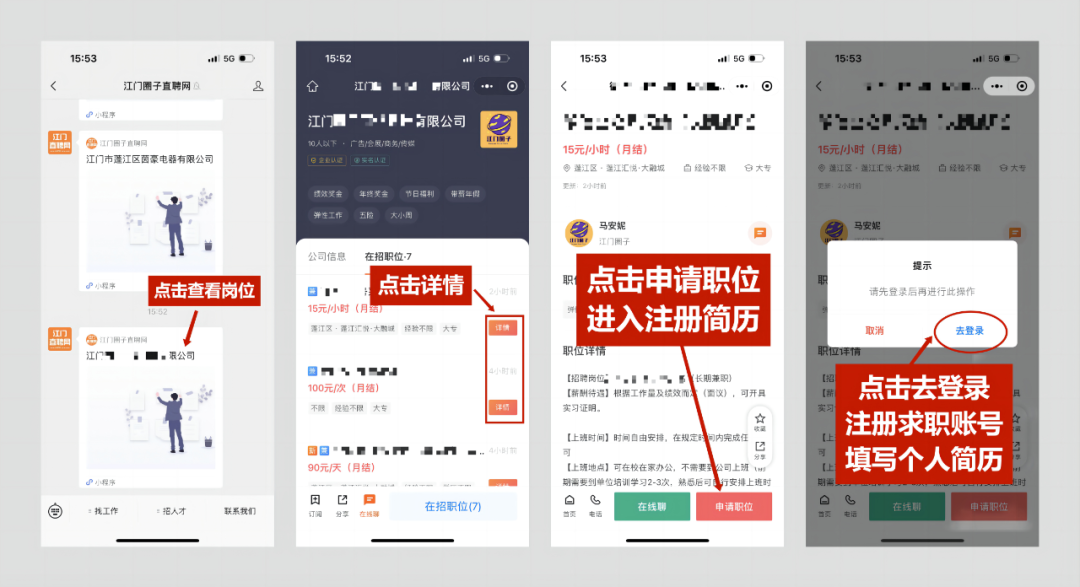 第一步:关注【江门圈子直聘网】,可以及时查看最新招聘、第一时间获取简历投递进度等。 第二步:识别每个岗位下方二维码,即可查看职位详情并应聘❤ 第三步:查看岗位后,点击【去登录】注册求职账号,填写个人信息。