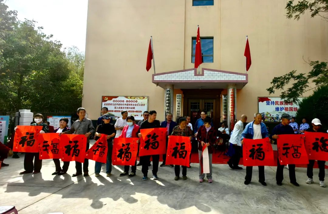 活动中,市文联干部走访慰问了各自的结对关爱帮扶户,为他们送去了月饼、牛奶等慰问品,提前祝福他们中秋节快乐;为全村45户结对关爱帮扶户赠送了“福”字书法作品,预祝他们生活幸福安康;56名文艺志愿者为村民奉献了敦煌民歌、眉户表演唱、敦煌舞、诗朗诵、琵琶独奏、器乐合奏等文艺节目,送文艺大餐进村,祝福村民们节日快乐。市书协的书法家们还现场为村民们书写了书法作品,深受群众喜爱。
