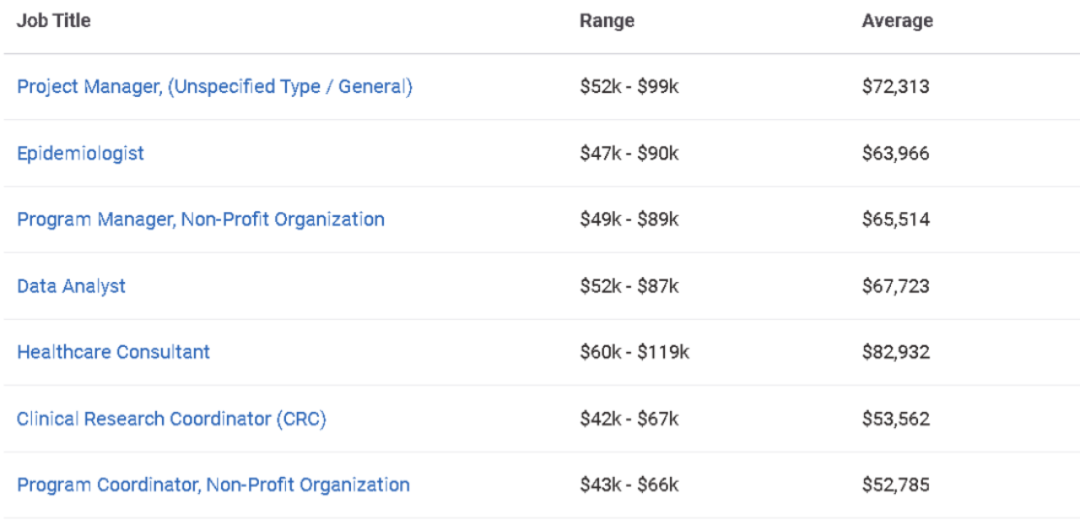 公共健康领域未来发展趋势良好 近年来,随着人口的不断增长、全球新冠疫情的蔓延,社会对公共健康的研究不断重视起来,这意味着公共健康领域具有极大的发展潜力。 在这样的环境下,相关岗位的需求也在大幅增长。毕业生的就业方向非常多元化,包括公共健康或临床科研、流行病学家、生物统计学家、卫生保健管理、公共卫生顾问等,平均年薪在7万美元左右!
