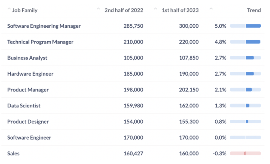 最近,掌握最全薪资数据的levels.fyi公布了2023年年中薪资分析报告,帮助人们快速的了解不同公司的职能、薪资待遇等情况。 2024fall申请季正在如火如荼的进行中,今天小编便来带大家看看,哪些专业兼具前景与“钱景”,为同学们的专业选择提高参考~ 2023年中薪资报告 在2023年年中薪资分析报告中,大多数职位都呈现出了积极的趋势,薪资水平增幅明显。 薪资最高的TOP10分别为:软件工程经理、技术项目经理、商业分析师、硬件工程师、产品经理、数据科学家、产品设计师、软件工程师、销售。 另外,近年来广受关注的工程、数据类相关行业的热度依然呈增长趋势 商业分析师、数据科学家的薪资较2022年下半年再次增长,涨幅分别为2.7%和1.3%;软件工程师的薪资相比2022年下半年并无变化;而销售则相比下降了0.3%。