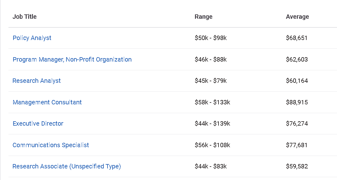 公共事务领域急需专业化人才 基于现实的需求,社会对拥有公共事务分析处理能力的专业化人才越来越重视,如果你拥有公共事务方向的研究生学位,你会更加有竞争力。 如今,公共部门的职能越来越多样化,例如项目评估、政策分析和财务管理、社会组织管理、数据分析等职位。 另外,公共事务硕士毕业生不仅可以去非营利性组织做管理,也可以在大学从事学术研究,在企业从事管理咨询,沟通专员等岗位,这些职位的平均年薪7万美元左右!