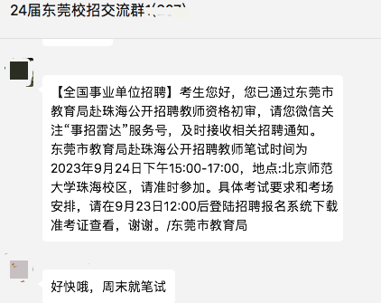 【全国事业单位招聘】考生您好,您已通过东莞市教育局赴珠海公开招聘教师资格初审,请您微信关注“事招雷达”服务号,及时接收相关招聘通知。东莞市教育局赴珠海公开招聘教师笔试时间为2023年9月24日下午15:00-17:00,地点:北京师范大学珠海校区,请准时参加。具体考试要求和考场安排,请在9月23日12:00后登陆招聘报名系统下载准考证查看,谢谢。/东莞市教育局