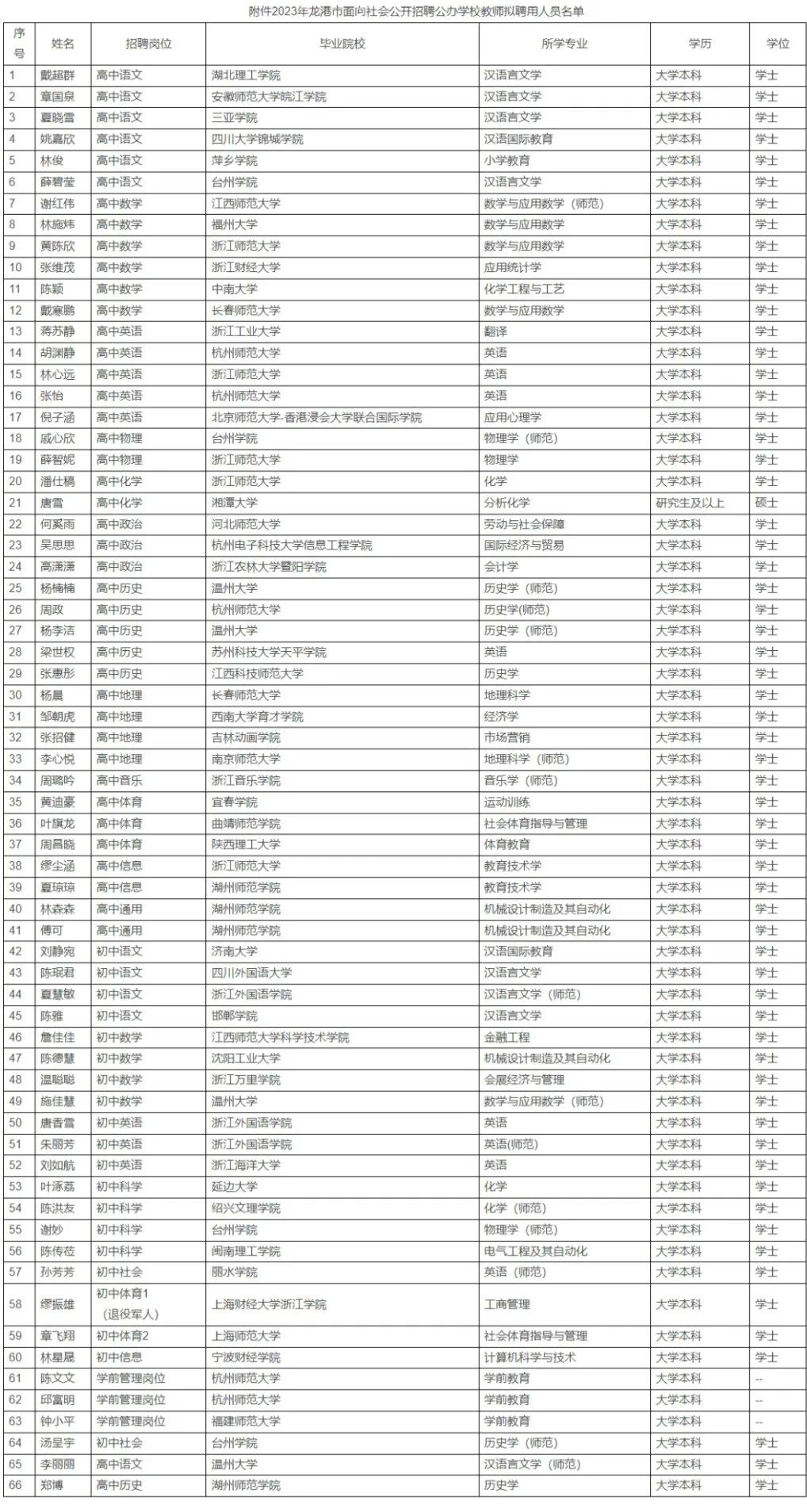 2023年龙港市面向社会公开招聘公办学校教师拟聘用人员公示 根据《2023年龙港市面向社会公开招聘公办学校教师的公告》要求,经相关招聘程序,拟聘用下列人员为相关用人单位工作人员,现予以公示。1. 公示时间:2023年9月18日至2023年9月27日止,7个工作日。2. 在公示期限内,任何单位和个人均可通过来信、来电、来访的形式,实事求是地向龙港市社会事业局反映公示对象存在的问题。以单位名义反映问题的应加盖公章,以个人名义反映问题的提倡署报本人真实姓名,并提供必要的调查线索。来信的有效时间以发信时的邮戳为准。3. 监督单位及受理电话:龙港市社会事业局人事科0577-59911862。附件:2023年龙港市面向社会公开招聘公办学校教师拟聘用人员名单 拟聘用人员名单 ↓↓