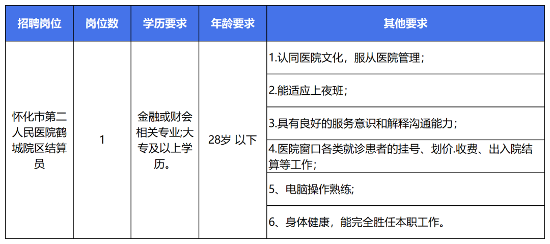 因岗位需求,湖南省湘辉人力资源服务有限公司现面向社会公开招聘1名劳务派遣人员至怀化市第二人民医院工作,具体招聘事项如下: (一)坚持德才兼备、以德为先的用人标准; (二)坚持公开、平等、竞争、择优的原则; (三)注重综合能力和专业知识相结合原则。 ![]() (一)具有中华人民共和国国籍; (二)遵守中华人民共和国宪法和法律; (三)具有良好的品行和职业道德; (四)具有岗位所需的专业或技能条件,岗位所要求的专业以教育部学科专业分类目录为准; (五)适应岗位要求的身体条件及其他条件。 有下列情形之一的人员,不得参加报名: 1、尚未解除党纪、政纪处分或正在接受组织调查的人员; 2、涉嫌违法犯罪正在接受司法调查尚未做出结论的人员; 3、在各级各类单位公开招聘中因违反规定被记入公开招聘应聘人员诚信档案库,且记录期限未满的人员。 ![]() (一)信息发布 通过湖南省湘辉人力资源服务有限公司官网于2023年9月21日面向社会公开发布。 (二)报名 1、报名时间:2023年9月21日至2023年9月23日17:30。 2、报名咨询电话:19911308443。 3、报名方式:采取网上报名方式(不收报名费)。 需要提交的资料: ①招聘考试报名表(见附件一),报名表需手写签名; ②本人有效身份证; ③毕业证书及复印件,学信网《学历证书电子注册备案表》《学籍认证报告》; ④其他相应证件。 网上报名将以上资料原件以PDF文件发邮箱 (yanghuan@hnxianghui.com)。 4、报名要求:应聘人员必须符合应聘条件,填写的报名信息、提供的证书和资料必须完整、真实、有效、准确。在任一个环节发现应聘者不符合应聘条件或弄虚作假的,随时取消应聘资格,如涉及违法的,招聘单位有权向相关部门反映并追究相应法律责任。 (三)资格审查 湖南省湘辉人力资源服务有限公司对报考人员进行资格审查。 (四)考试考核 采取岗位直接面试考核的方式进行。 (五)体检。 (六)签订劳动合同 与公司签订劳动合同,办理相应手续后,由公司指派到怀化市第二人民医院工作。 ![]() 岗位工资标准:临床专业技术岗位工资标准按照怀化市最低工资标准4倍执行,司机岗位工资标准按照怀化市最低工资标准4倍执行,护理、医技、管理员岗位工资标准按照怀化市最低工资标准3倍执行,工勤、护工岗位工资标准按照怀化市最低工资标准2.5倍执行。具体相关事宜由湖南省湘辉人力资源服务有限公司怀化分公司负责解释。 ![]() 1、资格审查合格人员须按通知要求到指定时间、地点参加考试考核,未按时参加者视为自动放弃应聘资格; 2、应聘者须在报名后保持本人手机畅通,对公司通知未在规定时间内回复的,视为自动放弃。凡因应聘者通信不畅通造成的后果,公司不予承担责任; 3、参加现场考试考核的应聘人员,须携带好本人身份证件原件; 4、所有应聘者必须提供真实、有效的证件及资料,凡提供虚假材料者,取消聘用资格。 ![]() 湖南省湘辉人力资源服务有限公司 2023年9月21日 ![]() END 招聘服务 用工服务 人才发展 管理咨询 产业研究 信息化服务 园区运营 国际业务 ![]() ![]() |