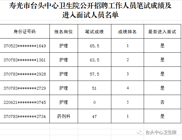 3.低于笔试最低合格分数的不能进入面试,进入面试人员名单详见附件《寿光市台头中心卫生院公开招聘工作人员笔试成绩及进入面试人员名单》。