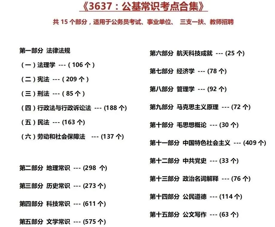 《公基3637》共计188页,分成15个部分,汇总了3637个公基常识考点,帮助你全面积累常识!