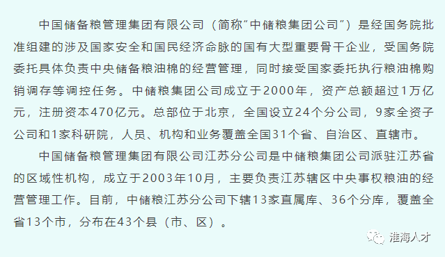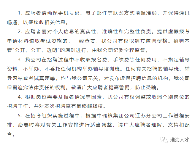 包括笔试、面试、面谈等环节。笔试采取线上的形式(其中仓储保管、质量检验岗位主要考察粮油仓储保管和质量检验的专业知识,机电维修岗位主要考察机电维修的专业知识),面试地点在江苏省南京市,具体时间、地点以短信、邮件或电话通知为准。除面试外,其他环节未通过人员不再另行通知。