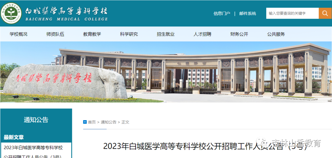 白城医学高等专科学校(https://www.bcyz.cn/)为本次公告(含补充公告)的发布网站。学校官方网站为此次公开招聘的工作网站,有关招聘事项及各种通知等信息,均通过工作网站进行发布,请考生注意查询。