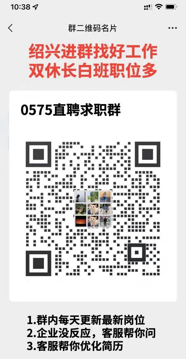 今日45个绍兴工作更新,想要知道更多最新的招聘求职信息,可以扫码进入下面的招聘群查看!