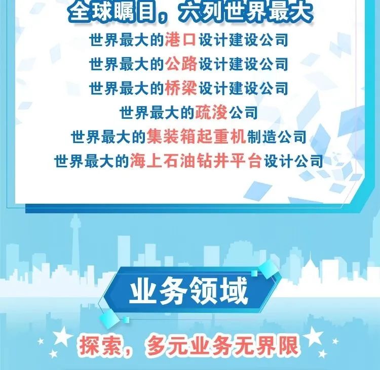 中国交通建设集团有限公司(以下简称“中交集团”)是全球领先的特大型基础设施综合服务商,主要从事交通基础设施的投资建设运营、装备制造、城市综合开发等,为客户提供投资融资、咨询规划、设计建造、管理运营一揽子解决方案和综合一体化服务。