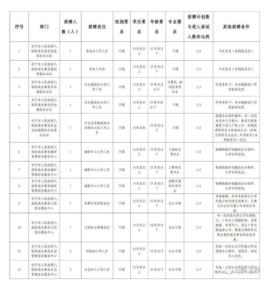 按笔试成绩由高到低1:2的比例确定参加面试人员。由安宁泰安保安有限公司和安宁市八街街道共同组织进行面试。
