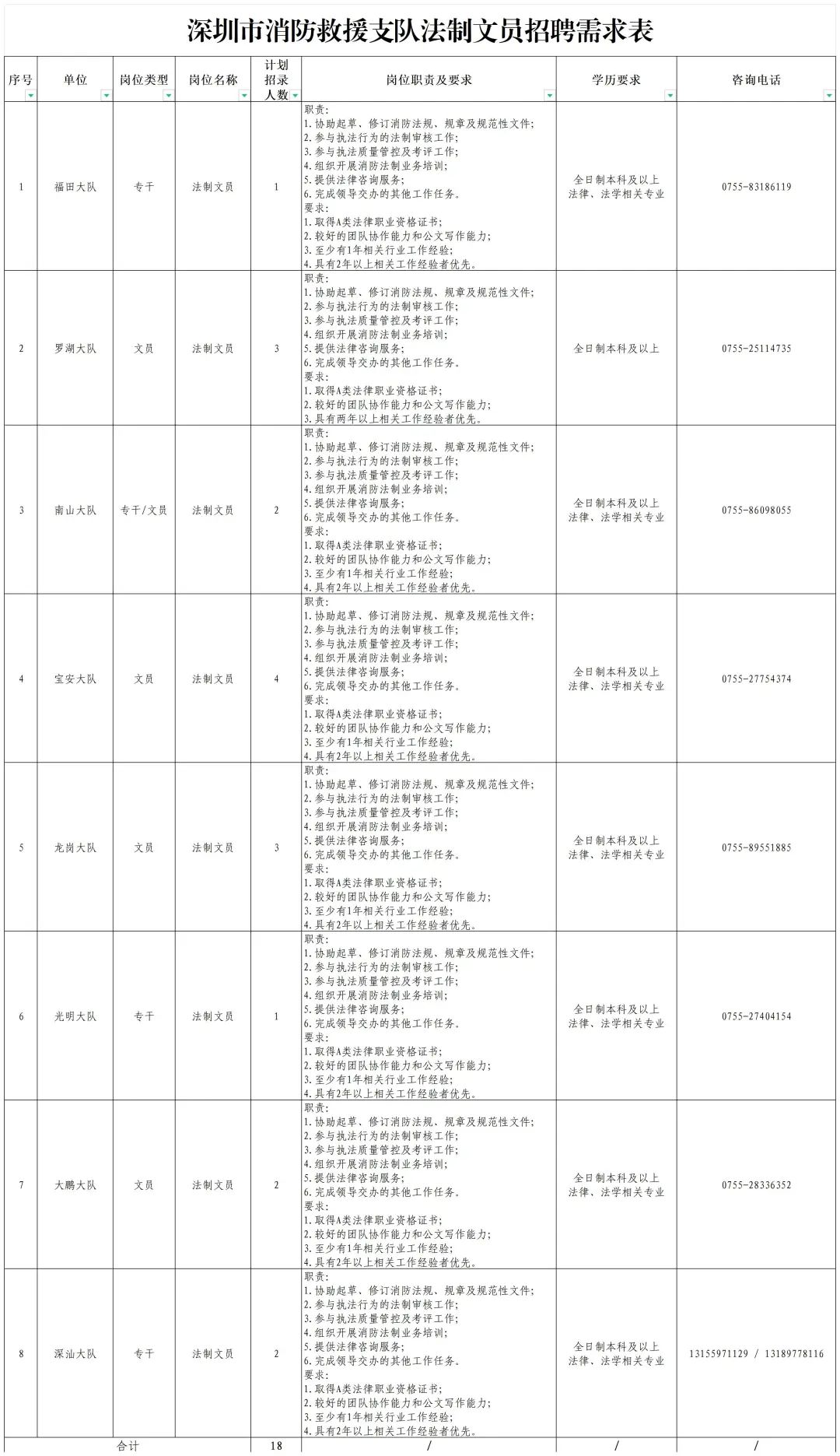 为切实提升深圳市消防救援支队下属各大队法制文员工作质效,进一步夯实基层法制保障,深圳市消防救援支队按照德才兼备和“公开、平等、竞争、择优”的原则,面向社会公开招聘法制文员18人。现将有关事项公告如下: