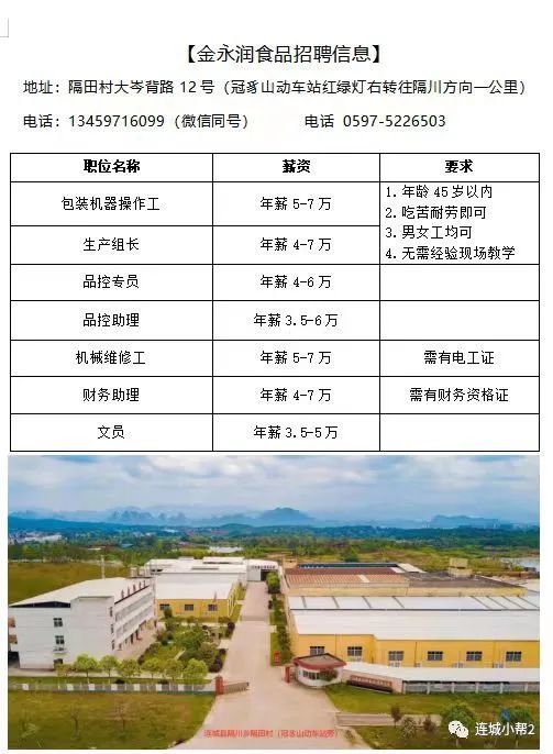 招聘,连城怡香食品有限公司,现招聘,车间生产普通工人,包装工人数名,月薪3000至9000元,可提供食宿。年龄45岁以下,手脚灵活,能吃苦耐劳,有责任心。工作地址,连城县魏坊村魏坊路15号(离连城县工业园区管委会300米处)联系电话,李先生13559309560
