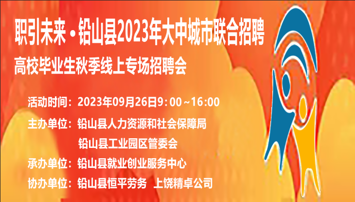 为深入贯彻习近平总书记关于高校毕业生就业工作的重要指示批示精神,落实党中央、国务院和省委、省政府关于高校毕业生就业工作的决策部署,促进高校毕业生高质量充分就业,根据人力资源社会保障部办公厅《关于开展职引未来——2023年大中城市联合招聘高校毕业生秋季专场活动的通知》精神,铅山县人力资源和社会保障局决定在9月26日举办2023年大中城市联合招聘高校毕业生(江西)秋季线上专场招聘会活动,现就有关事项通知如下:一、活动名称:职引未来——2023年大中城市联合招聘高校毕业生(江西)秋季线上专场招聘会活动时间:2023年9月26日9:00-16:00本次网络招聘活动将通过铅山人社公众号、铅山就业公众号、铅山人力资源网(www.ysrlzy.com)发布推送活动信息,加大宣传力度。铅山人力资源网网址:https://www.ysrlzy.com1、人力资源网企业会员:请用已注册的企业帐号登录发布招聘信息。2、非人力资源网企业会员:可先注册成为铅山人力资源网企业会员,然后用已注册的企业帐号登录发布招聘信息。3、人力资源网个人会员:请用已注册的个人帐号登录查找企业招聘岗位投简历。4、非人力资源网个人会员:可先注册成为铅山人力资源网个人会员,然后用已注册的个人帐号登录查找企业招聘岗位投简历。江西和立环保科技有限公司