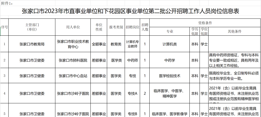 附件:1.张家口市2023年市直事业单位和下花园区事业单位第二批公开招聘工作人员岗位信息表
