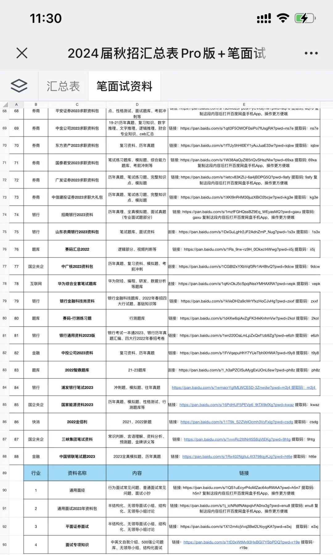 行业:外资投行、券商、事务所、公募基金、银行、互联网、快消、咨询、地产公司、国企央企等等 公司:招商证券、申万宏源、广发证券、方正证券、国泰君安、光大证券、瑞银集团、汇丰银行、德意志银行、易方达基金、汇添富基金、博时基金、华夏基金、央行、国开行、进出口银行、农业发展银行、五大行、建设银行、浦发银行、MBB、国家电网、中国石油、腾讯、字节跳动、阿里巴巴、华为、四大、立信、碧桂园、保利地产、恒大、万达、戴德梁行等等 其他:简历大礼包、北京/上海落户名单、各行业薪资表......