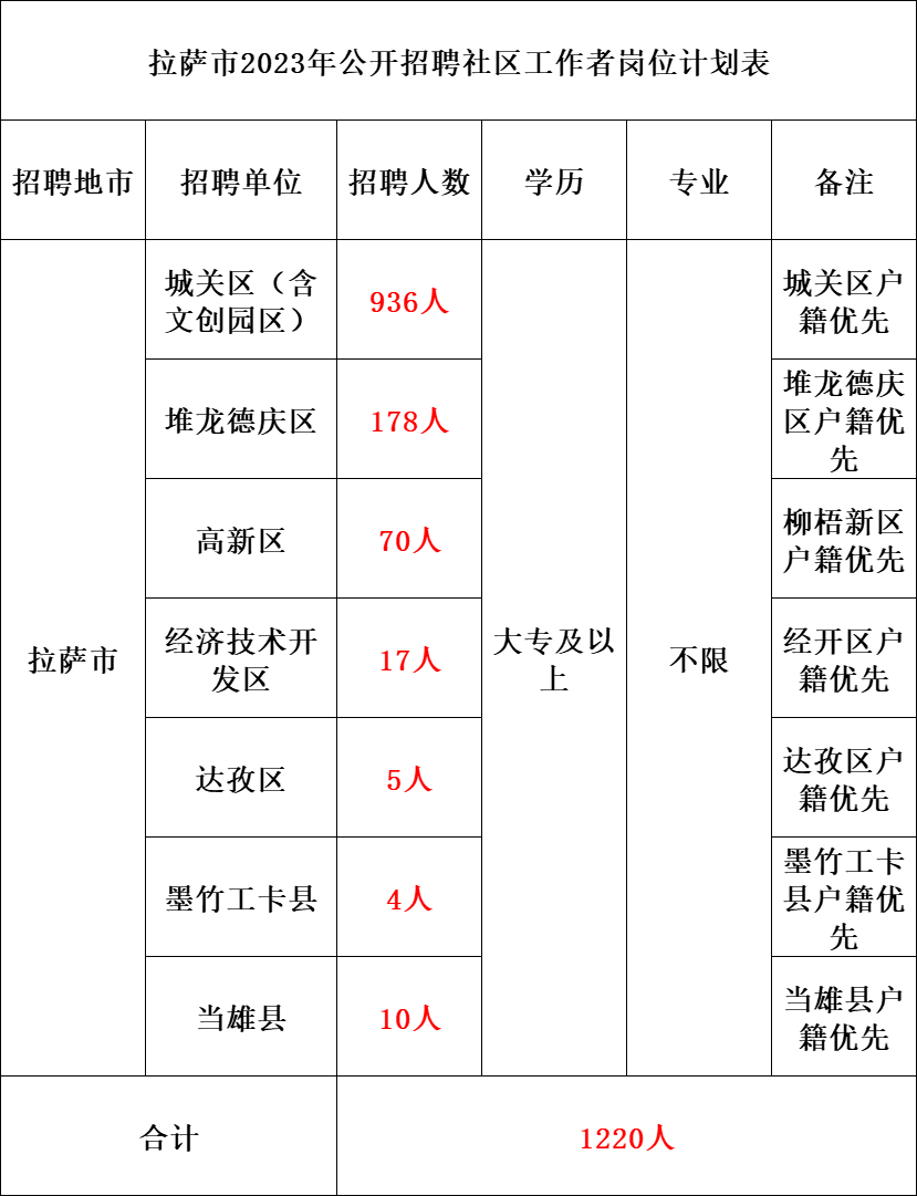 拉萨市2023年计划公开招聘社区工作者1220人点击获取职位表。(具体岗位计划详见附件1)。