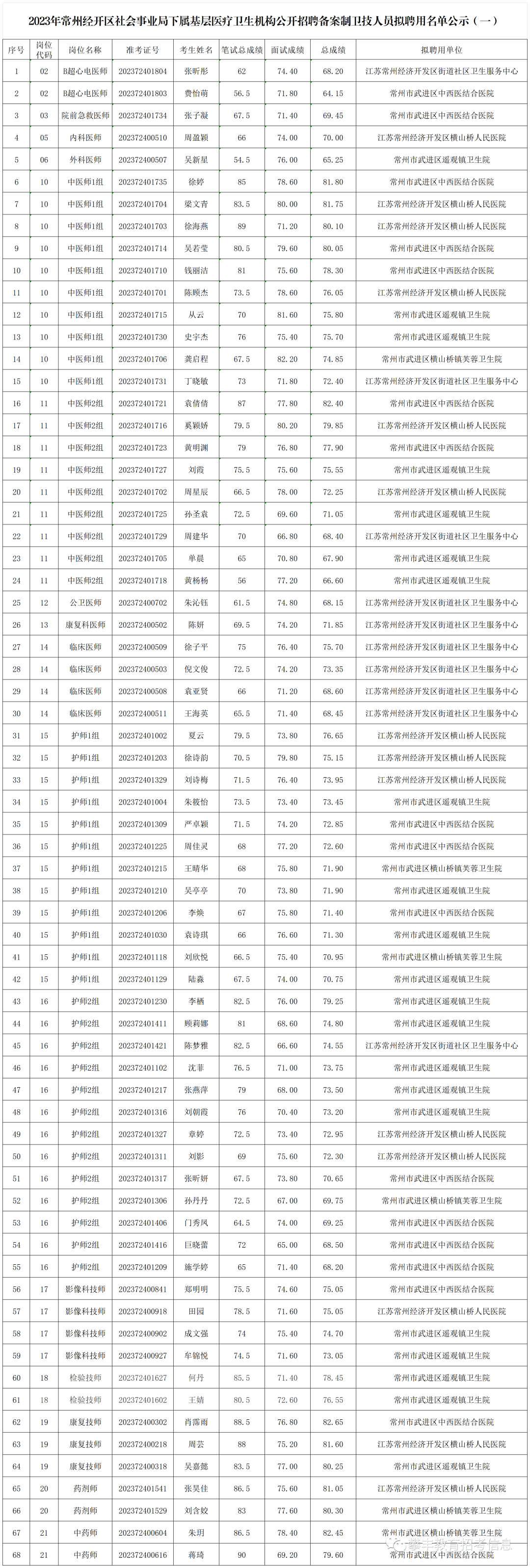 根据2023年7月3日发布的《2023年常州经开区社会事业局下属基层医疗卫生机构公开招聘备案制卫技人员公告》有关规定,经报名、资格审核、考试考核、体检、考察等程序,确定68位拟聘用人员,现面向社会进行公示,公示期为7个工作日,自2023年9月22日起,欢迎社会各界对以上同志是否符合招聘条件进行监督。