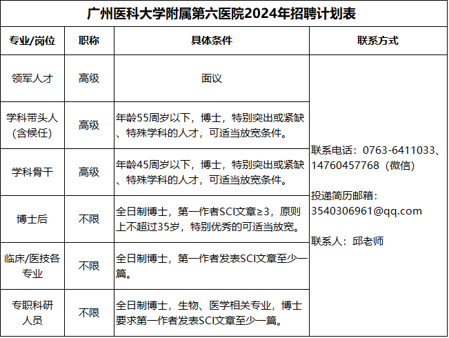 医护招聘温馨提示:广州医科大学附属第六医院,2024年度招聘学科带头人、临床医师、影像医师、病理医师、检验技师、康复治疗师、针灸推拿师、药师等人才。欢迎人才加入我院!